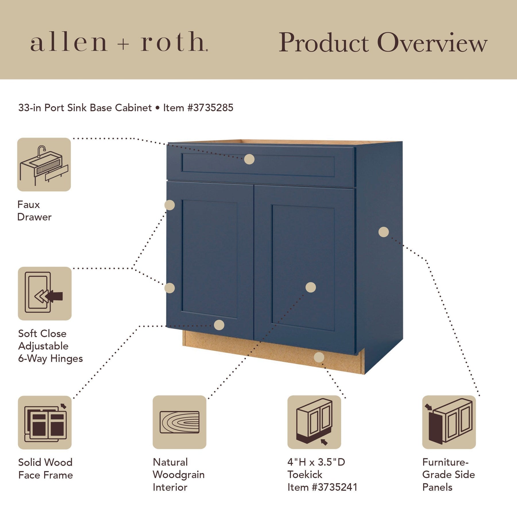 Transform your bathroom or kitchen space with the sophisticated allen + roth Port Sink Base Cabinet. This navy Shaker-style cabinet blends hardwoods and engineered materials for exceptional durability and features soft-close doors for a touch of modern luxury. Let this pre-assembled cabinet be the elegant centerpiece that pairs beautifully with various color schemes.