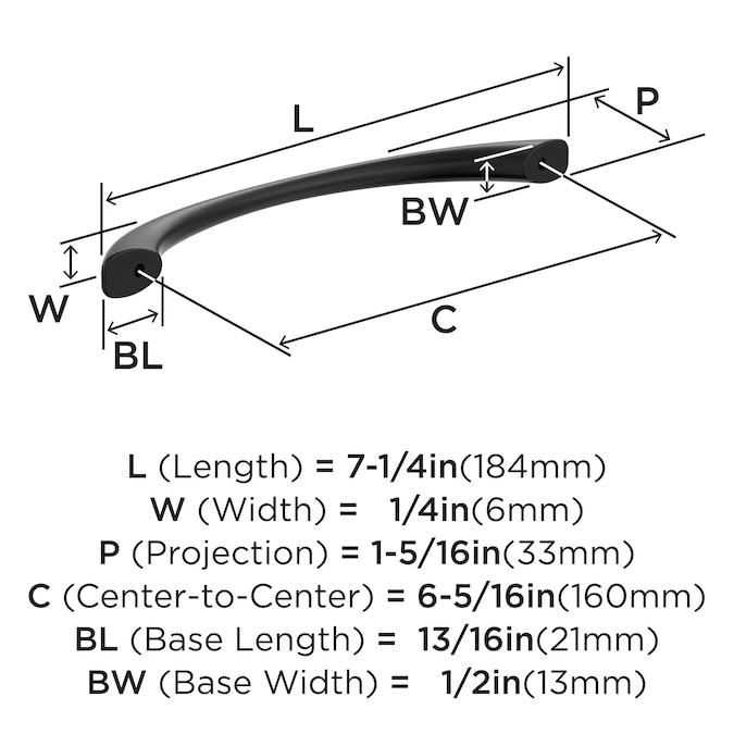 A: The Vaile Matte Black Drawer Pull measures 7.25 inches in length with a 6-5/16-inch center-to-center distance and a projection of 1.3125 inches.