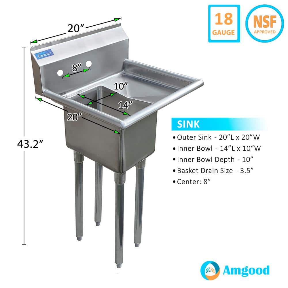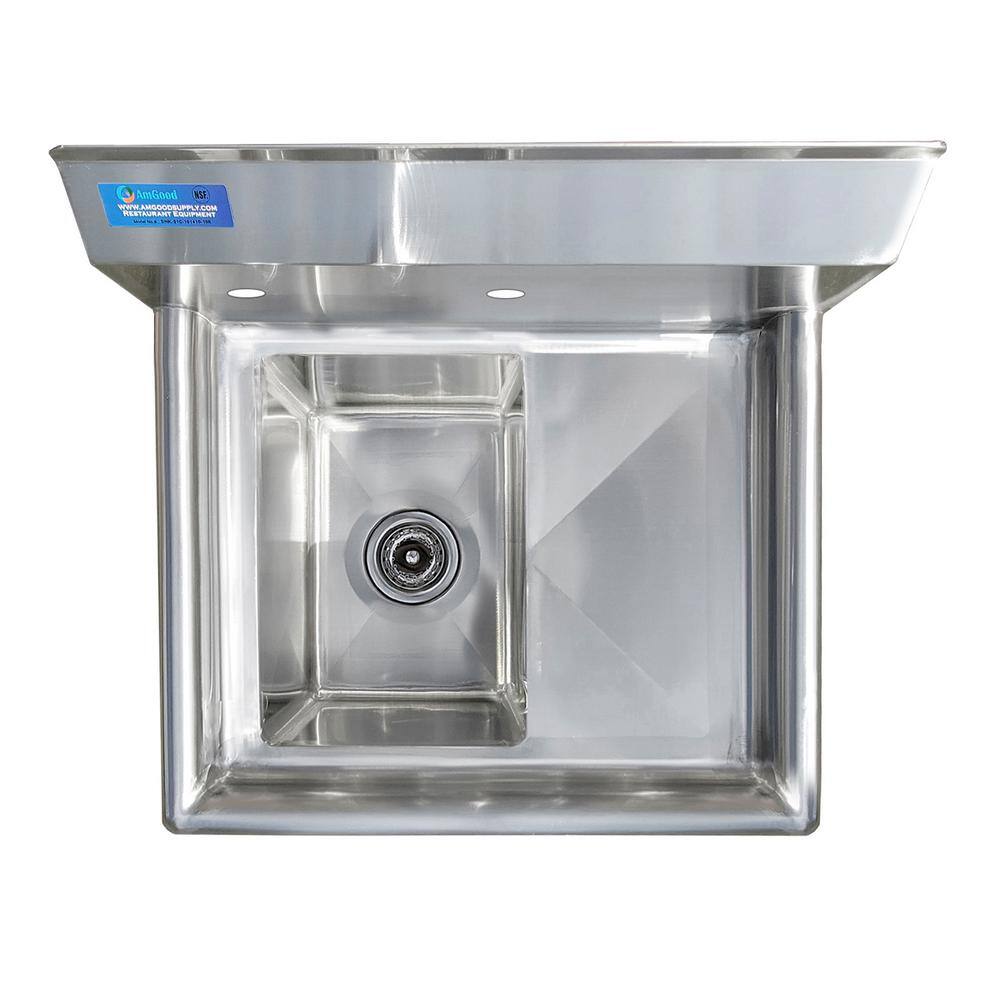 The AMGOOD 20x20 Stainless Steel Utility Sink with a right drainboard is constructed from premium 18-gauge type 304 stainless steel, offering durability and rust resistance. NSF certified for food service, this versatile sink is perfect for both commercial and domestic applications like kitchens, bars, and garages. Easy to install, it features a spacious compartment and a convenient drainboard to streamline cleaning tasks.