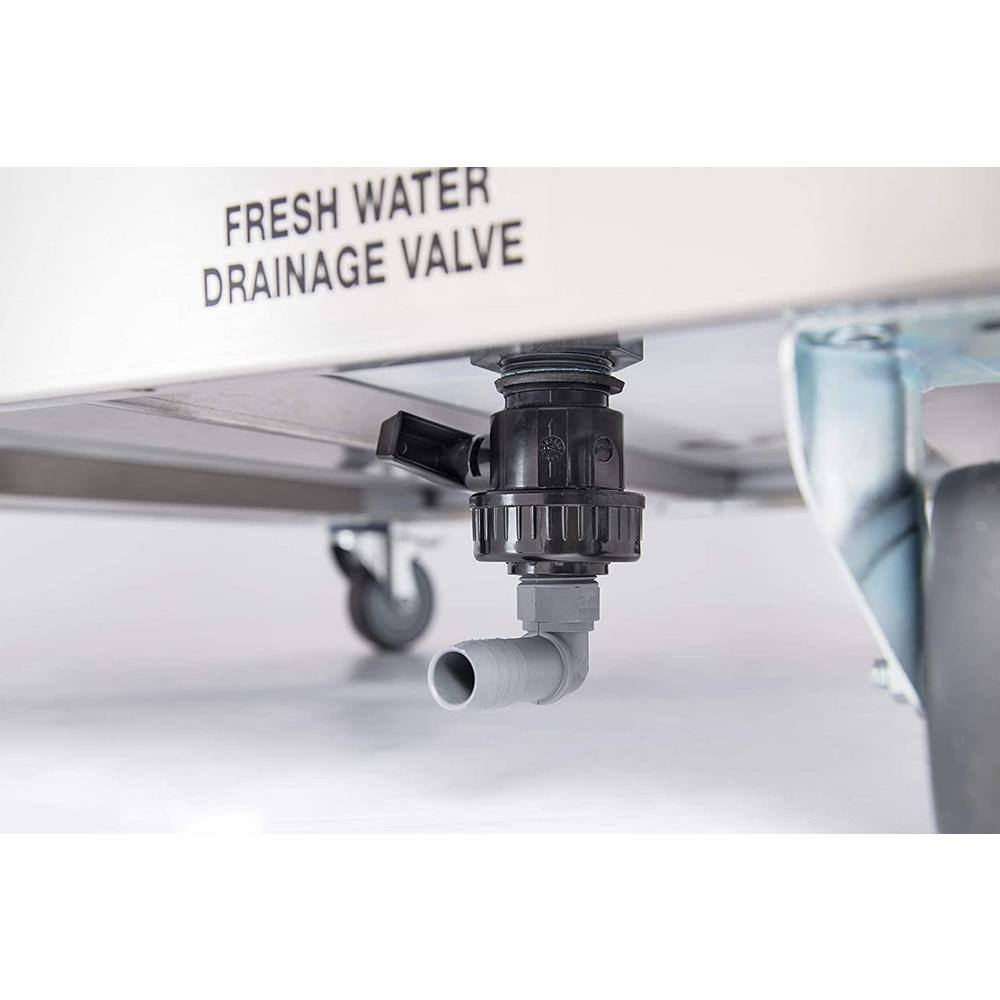 A: Simply plug the unit into a standard outlet, fill the freshwater tank, and connect to a drainage outlet for waste water. The unit arrives fully assembled for immediate use.