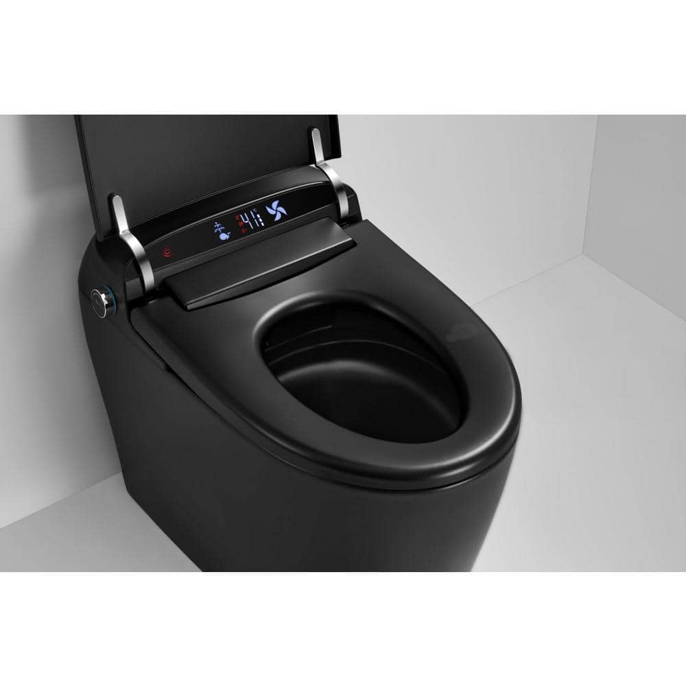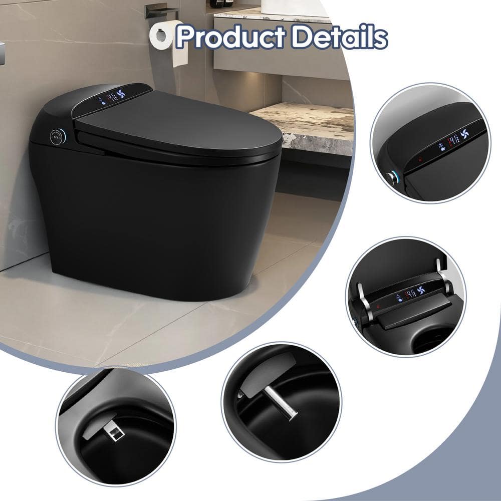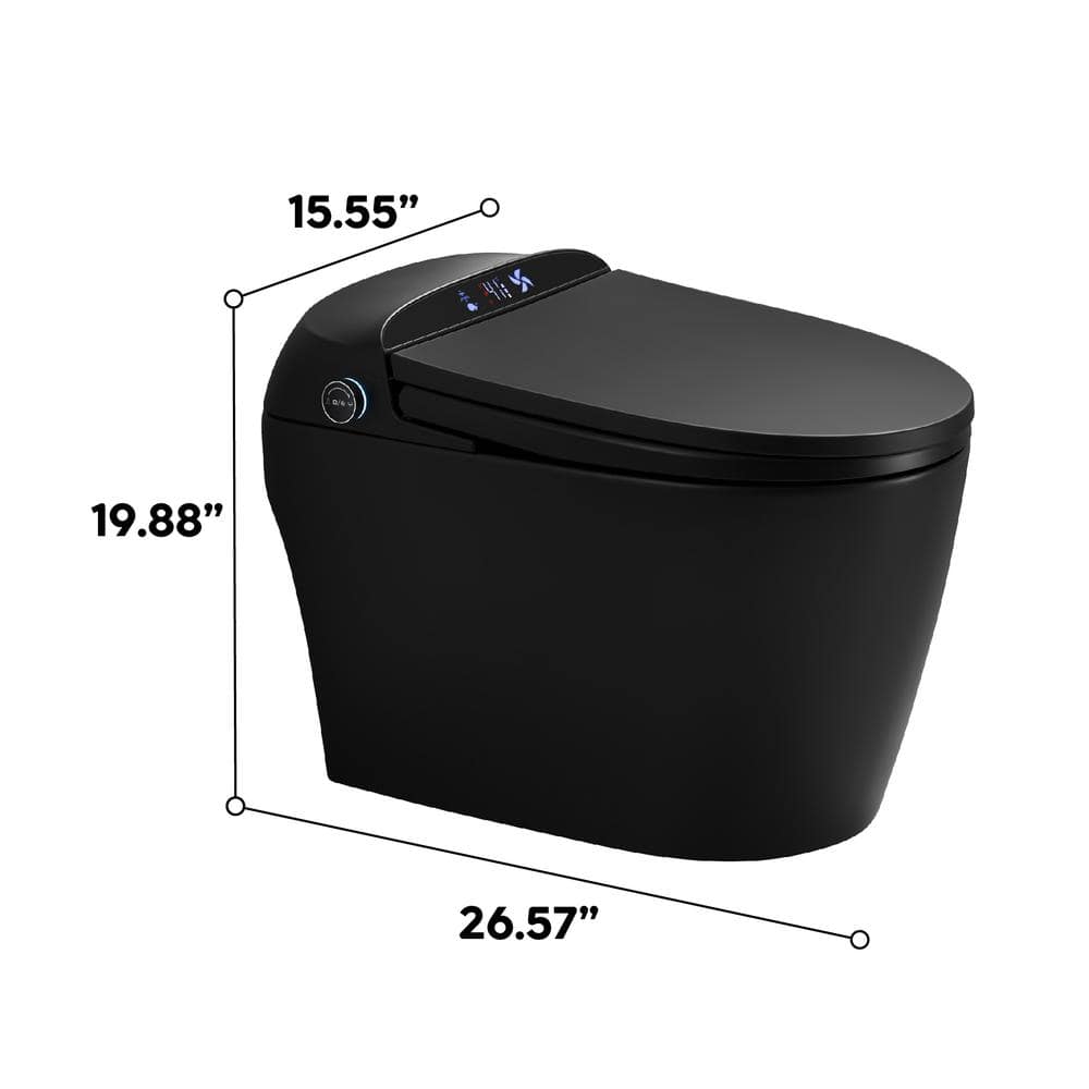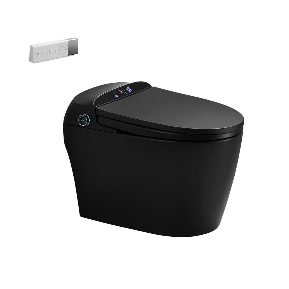 This sophisticated black smart toilet from ANGELES HOME transforms any bathroom with its sleek design and advanced functionality. Featuring a heated seat, auto flush, and warm air dryer, it offers the ultimate in comfort and convenience. Perfect for eco-conscious homes, it uses only 1.28 gallons per flush, combining luxury with efficiency.