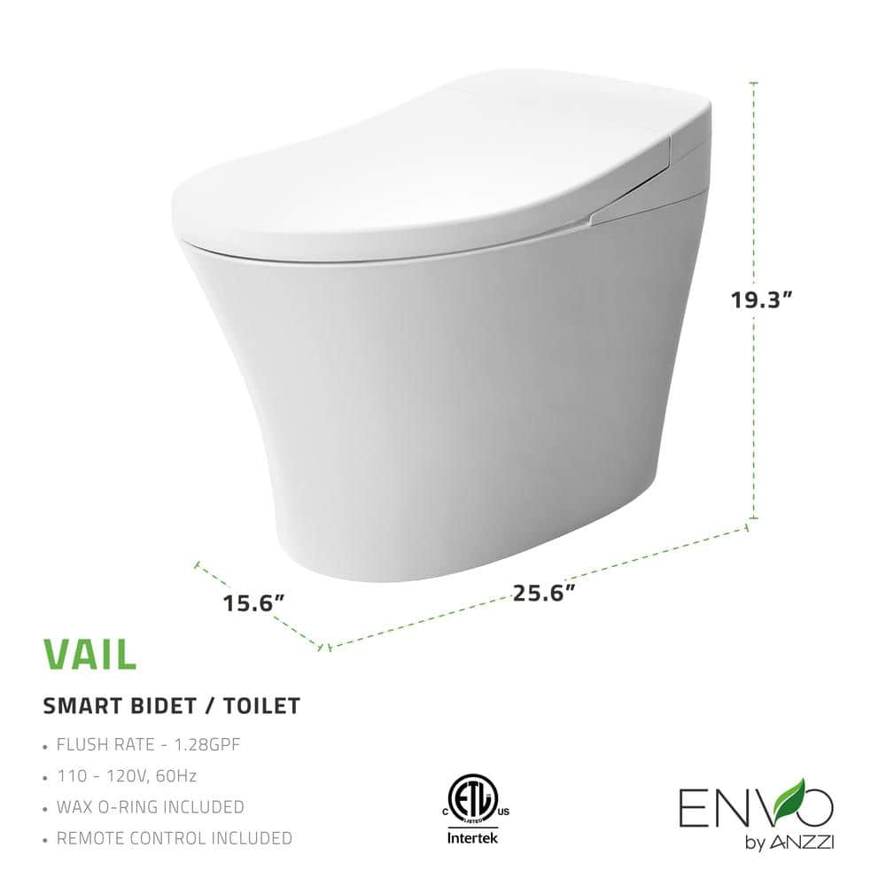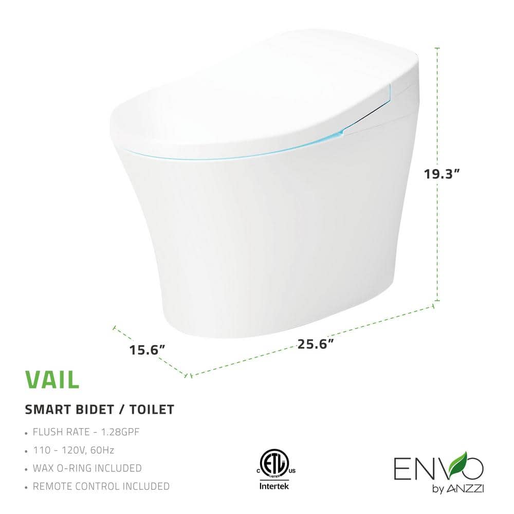 Step into the future of bathroom luxury with the ANZZI ENVO Vail Smart Bidet Toilet. Boasting eco-friendly features like reduced water usage and minimal electricity consumption, this toilet offers unparalleled cleanliness with its adjustable bidet and warm water jets. The heated seat and advanced remote control enhance comfort and convenience in your day-to-day life.
