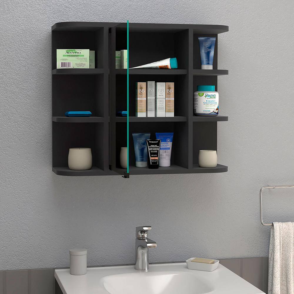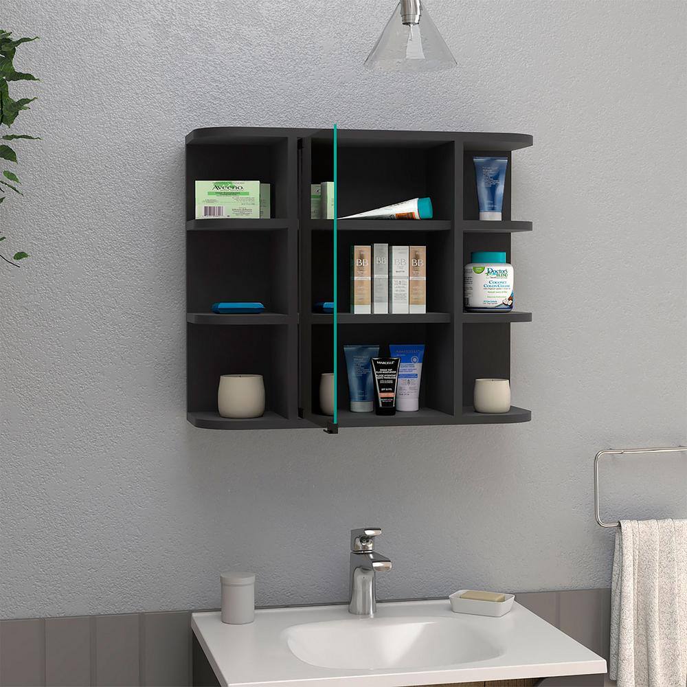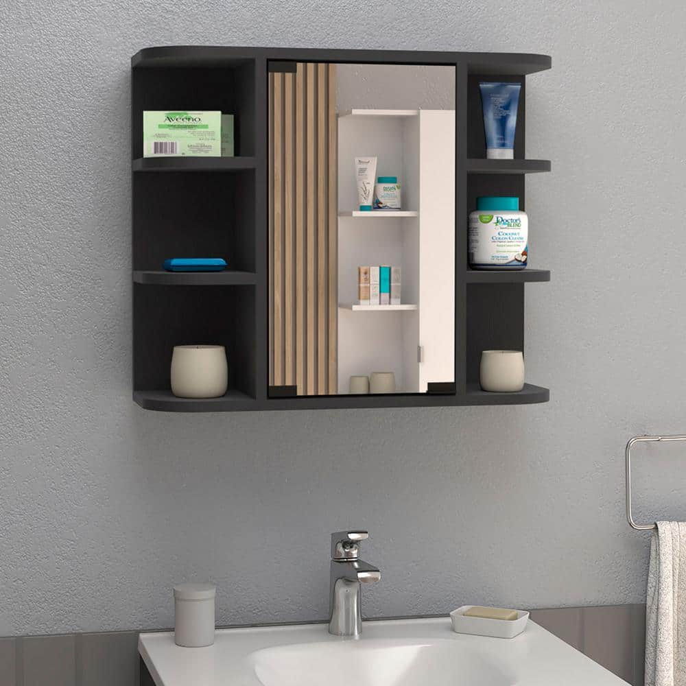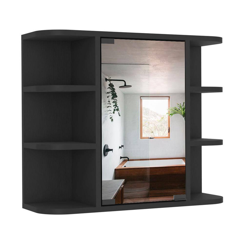 The Aoibox Black Wengue Medicine Cabinet is a perfect blend of style and functionality, featuring a 24 in. wide sleek mirror and 9 shelves for ample storage. Its center mirror panel offers both privacy and a convenient place for grooming. Crafted from high-quality materials, this cabinet promises durability and a contemporary touch to any bathroom setup.