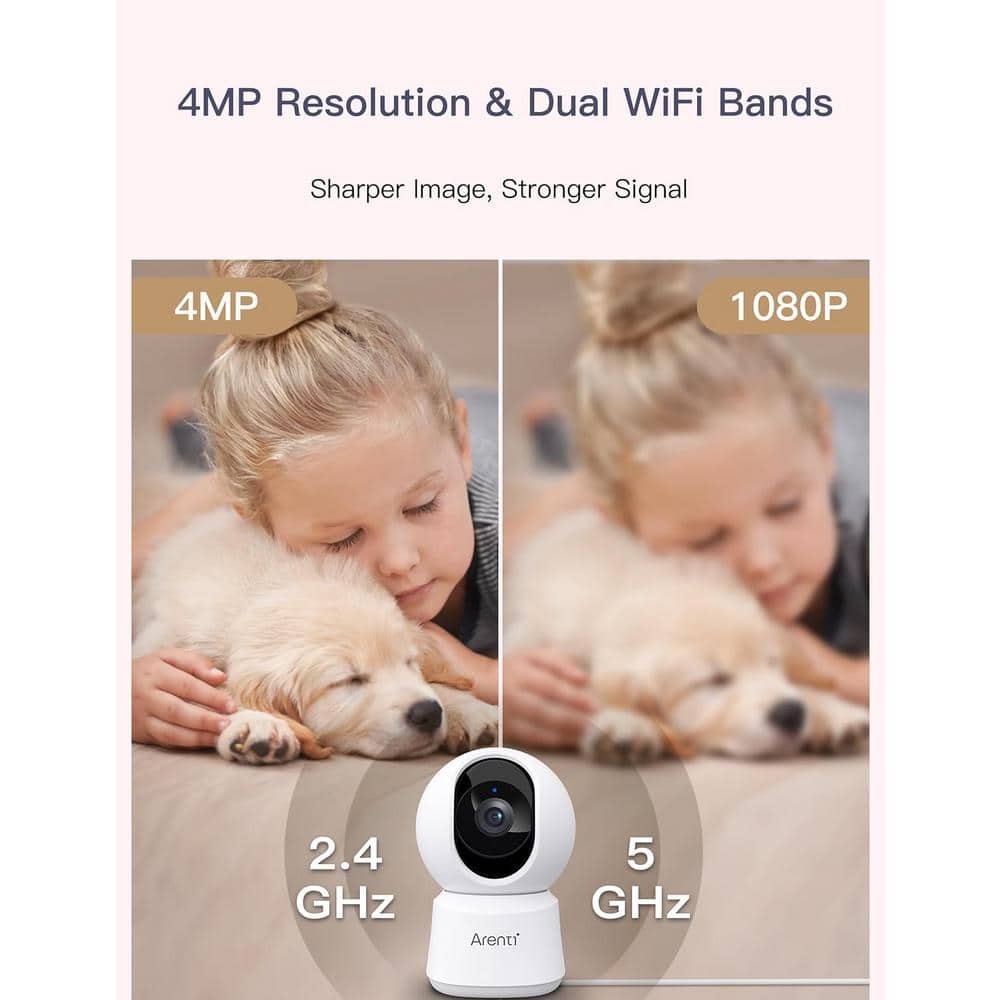 Elevate your home security with the ARENTI 5G 4MP Plug-In Security Camera, featuring dual-band WiFi connectivity for a robust, fast network connection. This camera delivers ultra-clear 4MP resolution and has super night vision capabilities for 24/7 monitoring with crisp, detailed images, even in low light. Use the 2-way audio function for real-time communication and enjoy enhanced security with AI-powered human motion and sound detection alerts. With support for Alexa and Google Assistant, home security has never been more convenient or connected.