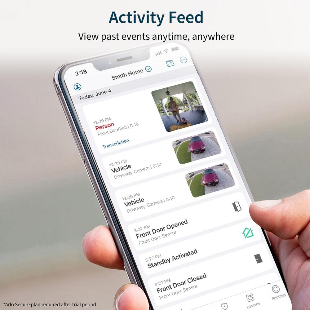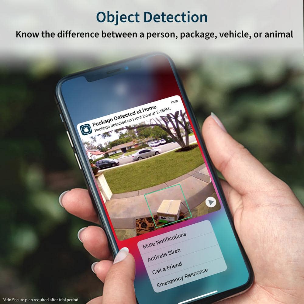 A: The Arlo Secure plan offers cloud storage, people/package/vehicle detection, and emergency response. A trial is included, but continued use requires a paid subscription.