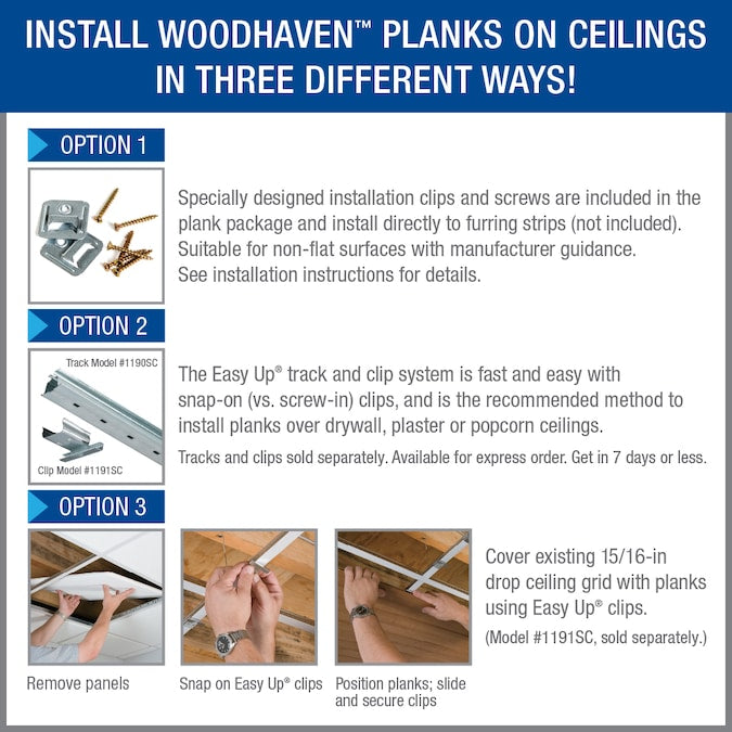 A: The planks can be installed directly to the ceiling joists, over an existing ceiling, or even on standard ceiling grid systems. Detailed instructions are provided to guide you through each method.