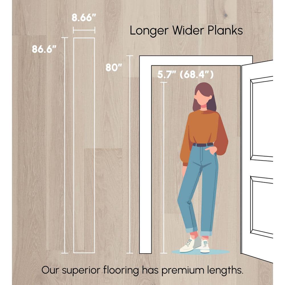 - Design: Extra-long planks up to 86.6 inches create a seamless, expansive floor