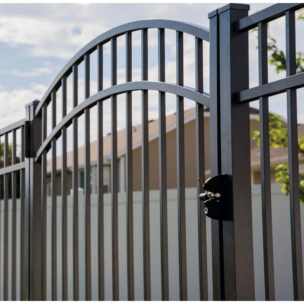 Transform your exterior spaces into a refined retreat with this precisely crafted fence gate. The graceful arch and sleek lines of its black aluminum create a sculptural focal point in any outdoor setting. Style it by lining the perimeter with lush greenery or minimalist lighting to highlight its distinguished design. This gate is more than just a protective measure—it's a statement of upscale living, encapsulating both form and function in one exquisite piece.