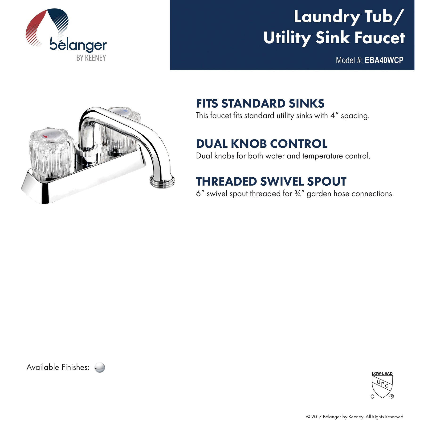 Upgrade any utility or laundry setup with Belanger's Essential Polished Chrome Dual Handle Utility Faucet. Designed for both residential and commercial environments, this durable fixture boasts a sleek, modern aesthetic while delivering unmatched functionality. Perfect for those demanding reliability and sophisticated design in their water fixtures.