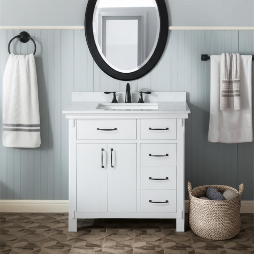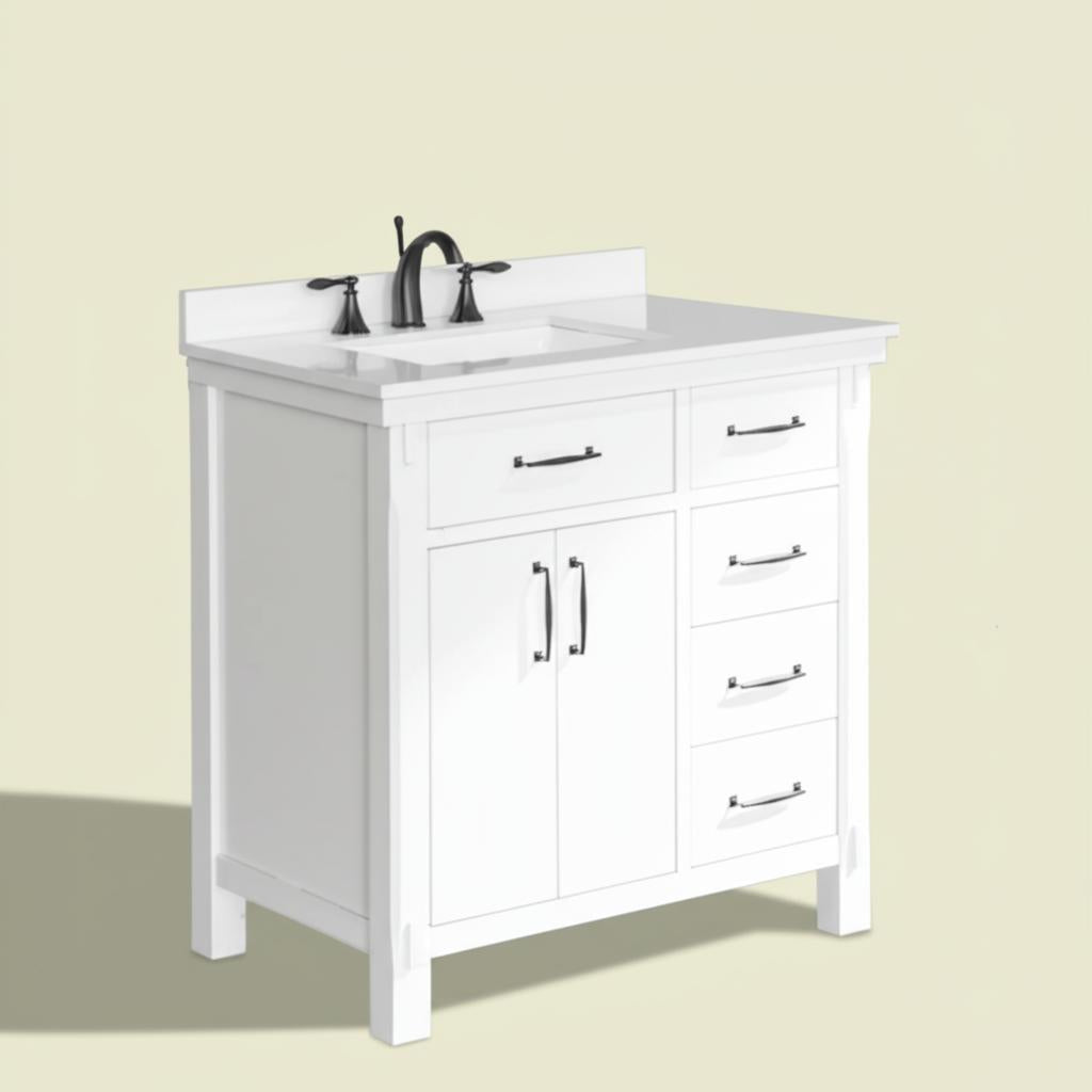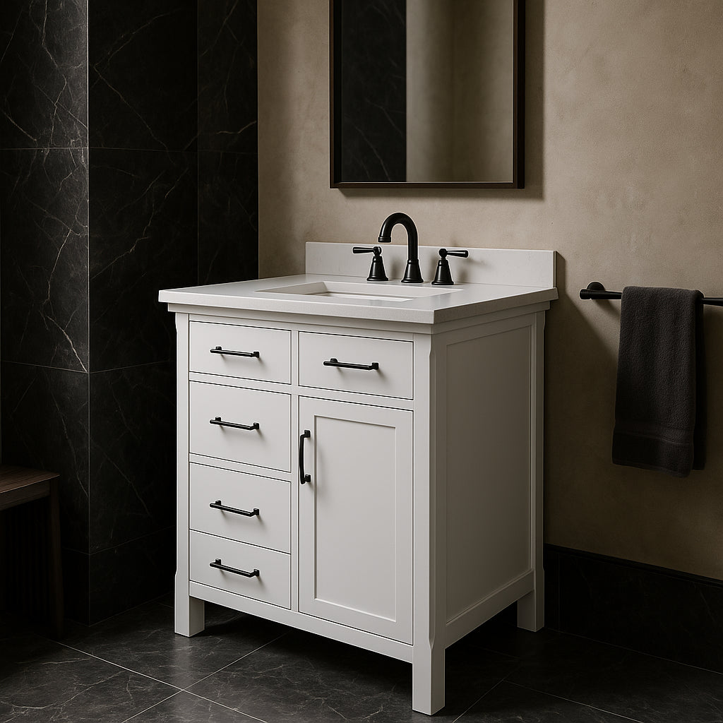 Transform your bathroom into a sanctuary of style with the Bellington Bath Vanity. Its crisp white engineered stone top and antique black hardware create a striking contrast, embodying modern sophistication. The soft-closing drawers and ample storage space ensure functionality meets elegance. Pair it with minimalist decor and a statement mirror to complete the look, making this vanity an essential centerpiece for luxurious living.