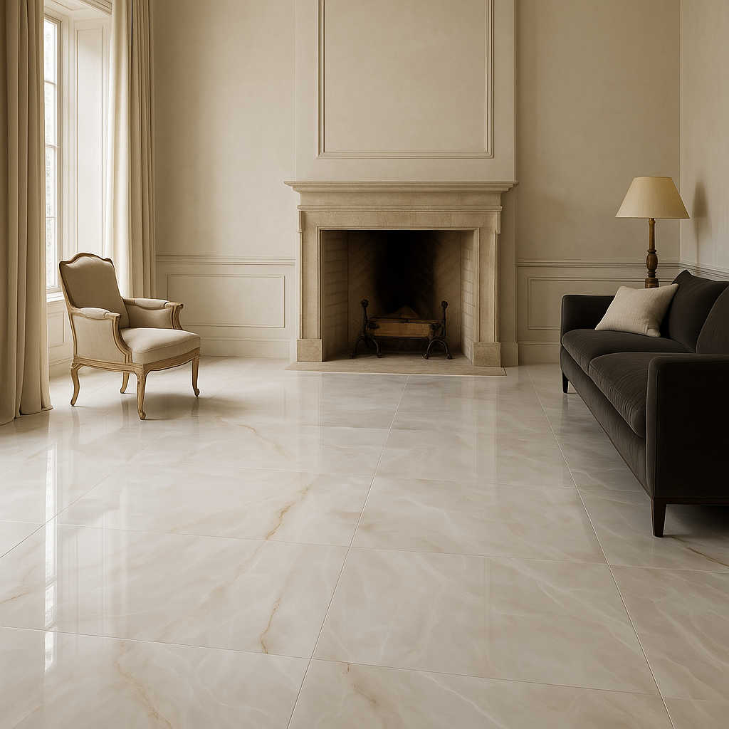 Enhance your space with the luxurious Bianco Onice Polished Porcelain Tile today.