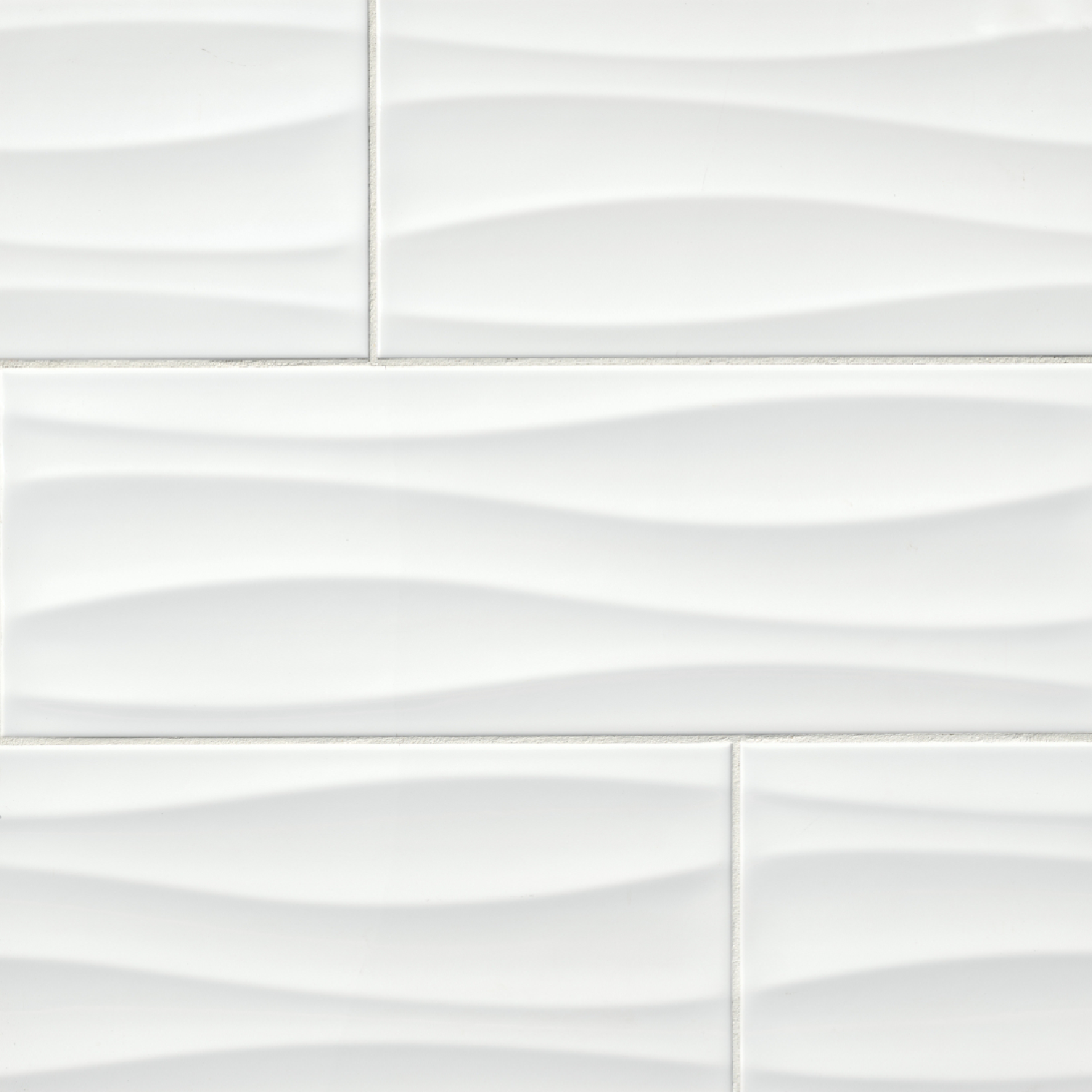 Introducing the Blanco Waves Ceramic Wall Tile - 8 x 24 in. by Fired Earth Ceramics. This exquisite tile transforms your bathroom into a serene oasis with its crisp, clean white finish and highly dimensional wave pattern. The glossy sheen adds a touch of sophistication, making it perfect for creating a stunning visual impact in your shower or as an eye-catching accent piece.