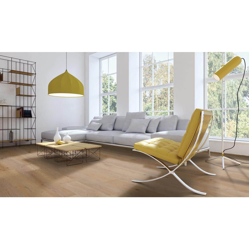The Zen White Oak Engineered Hardwood Flooring transforms any room into a serene haven. Each plank's gentle wire-brushed texture accentuates the natural grains, creating a living canvas of elegance and calm. Perfect for open-plan living spaces, its wide format invites a feeling of luxury that resonates throughout. Unveil harmony with each step, as the organic beauty of European White Oak becomes the foundation of exquisite living.