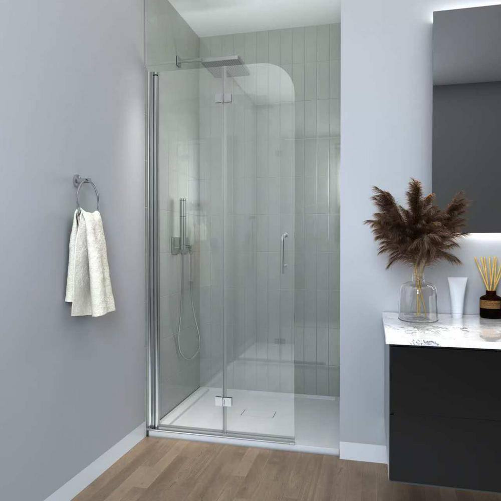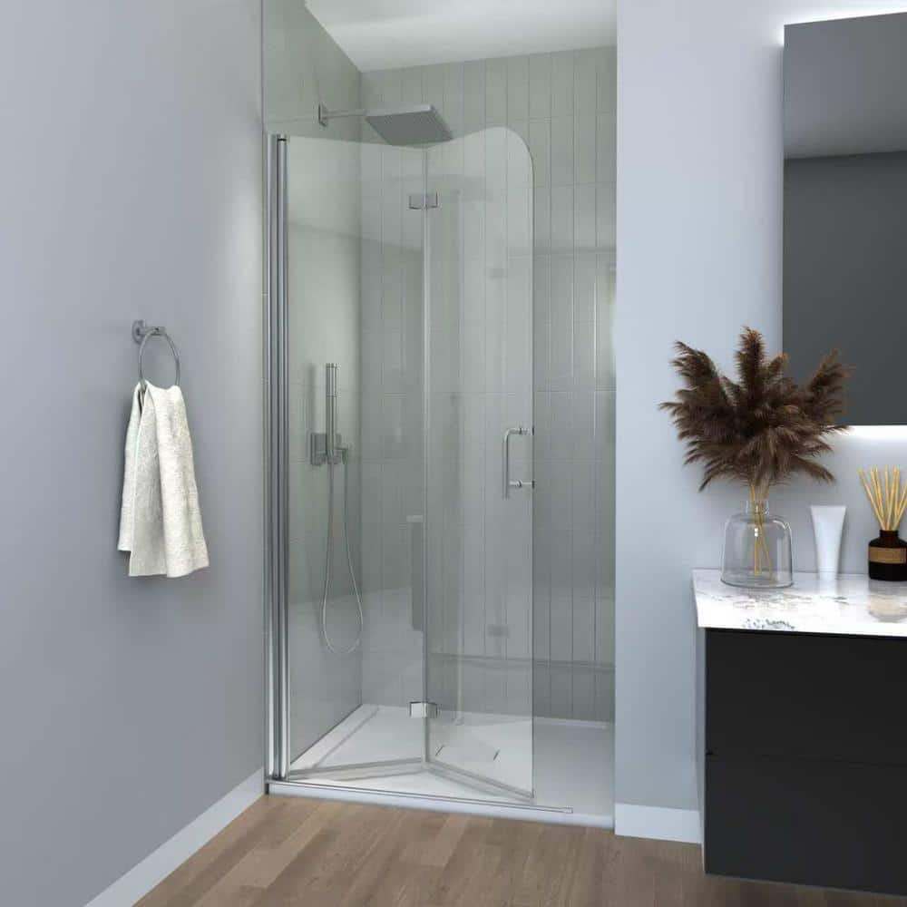 Enhance your bathroom with the Boosicavelly Bifold Frameless Shower Door, featuring a sleek chrome finish and clear tempered glass. This space-saving door offers a modern touch with its semi-frameless design, providing both elegance and durability for any shower installation or renovation project.