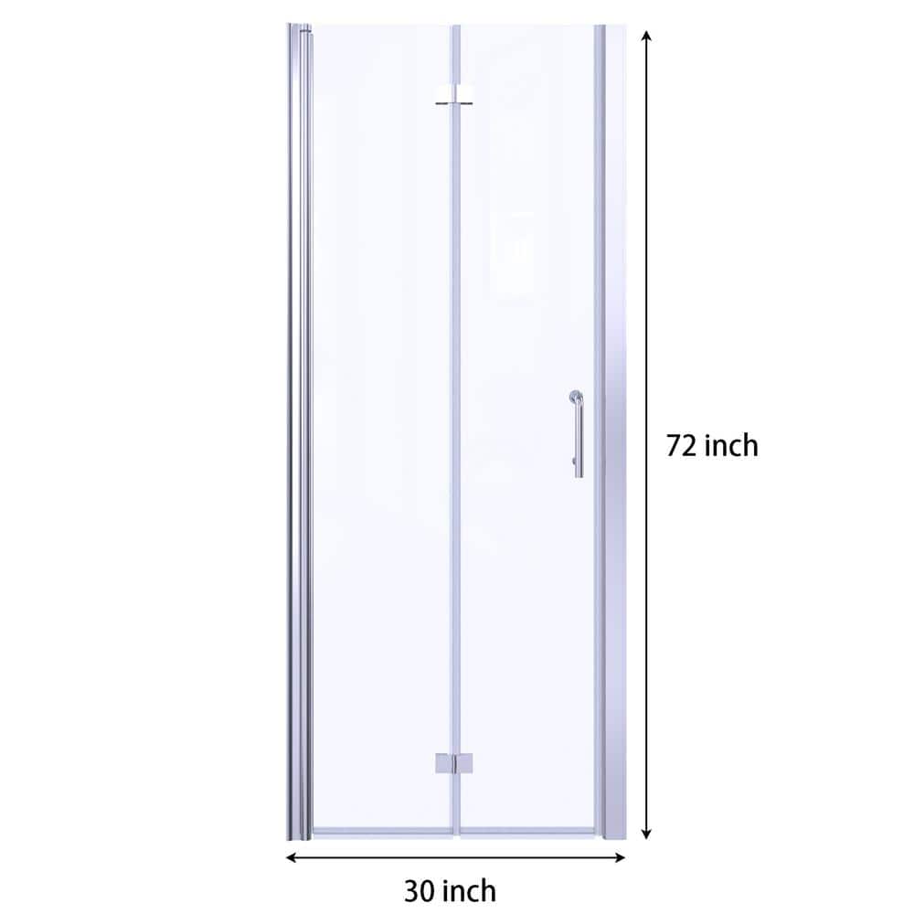 Elevate your bathroom with the Boosicavelly 30" Bifold Semi-Frameless Shower Door, featuring a sleek chrome finish and clear tempered glass. Designed for both elegance and functionality, this durable shower door saves space while providing a modern, aesthetic touch to any bathroom décor.