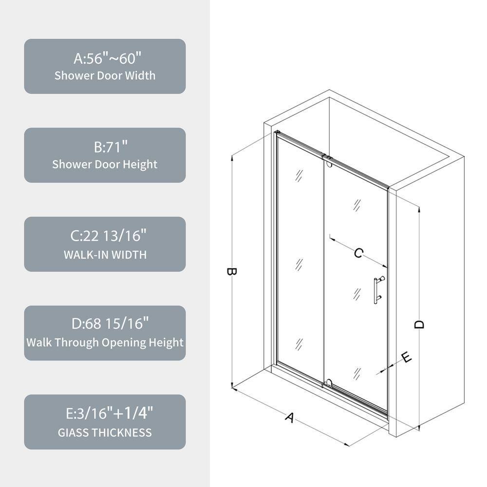 A: The shower door fits alcove spaces with widths ranging from 56 to 60 inches, so be sure to measure your space before purchasing.