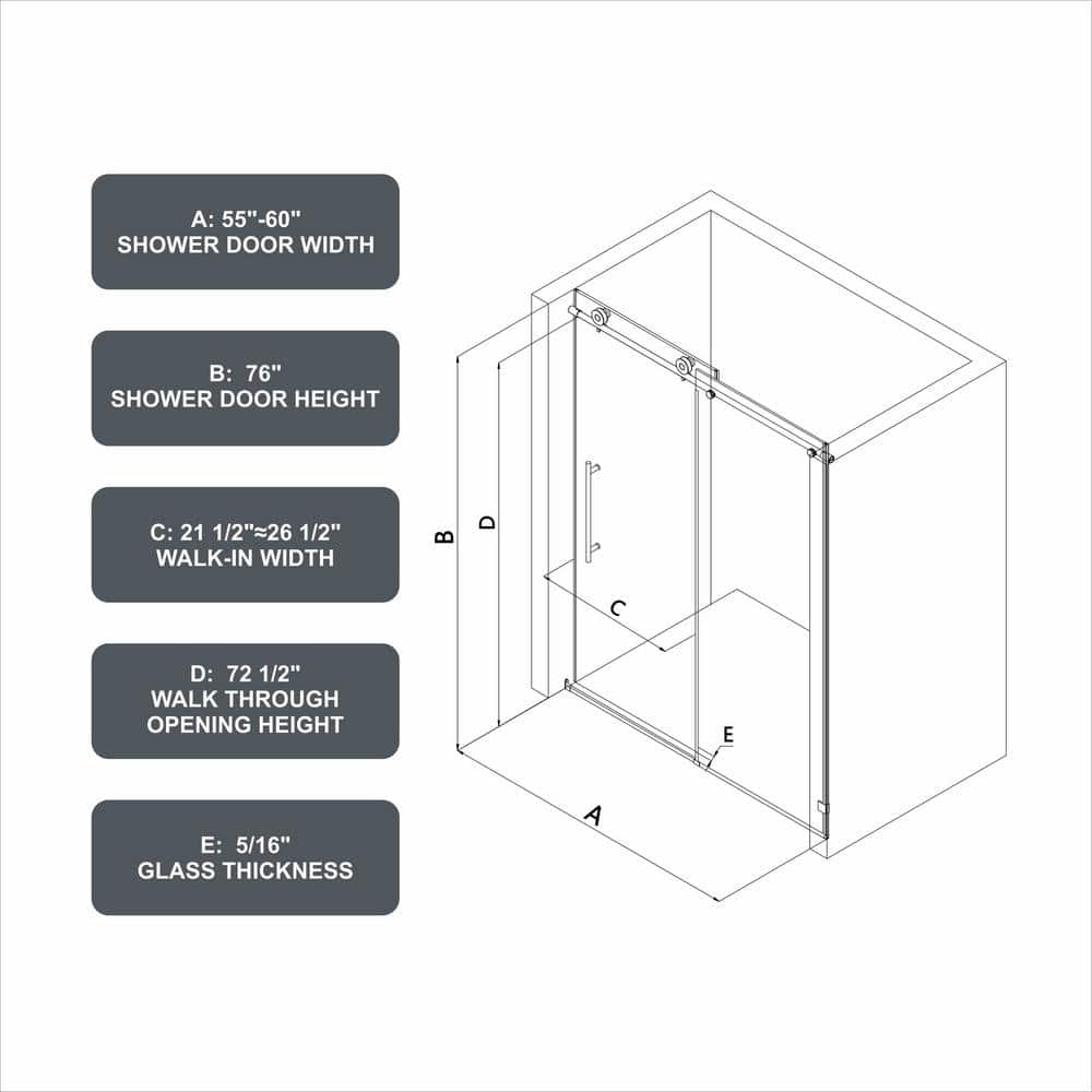 A: The shower door fits alcove openings with a width between 55 in. and 60 in.