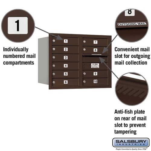 This recessed-mounted mailbox features 10 doors and a durable bronze finish, designed for private access and rear loading. Constructed from heavy-duty aluminum and stainless steel, it is ideal for secure mail storage in various settings.