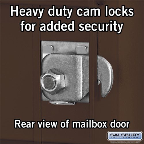 A: The mailbox includes heavy-duty cam locks with dust/rain shields and comes with 3 keys per lock.