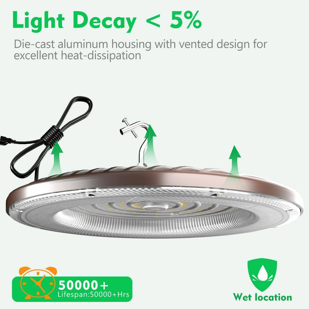 Revel in the extraordinary metamorphosis that unfolds under the glow of these LED wonders. With their striking UFO silhouette, these high bay lights add a futuristic charm while delivering unparalleled brightness to any space. Whether gracing the rafters of a cutting-edge workshop or presiding over a bustling warehouse, their sleek design effortlessly blends with industrial decor. Elevate your environment with this essential, illuminating masterpiece, the epitome of functional elegance.