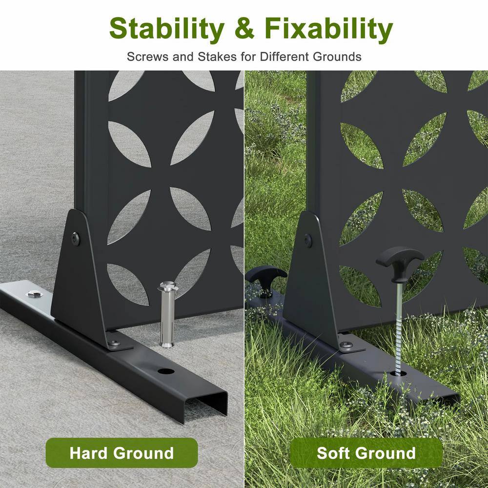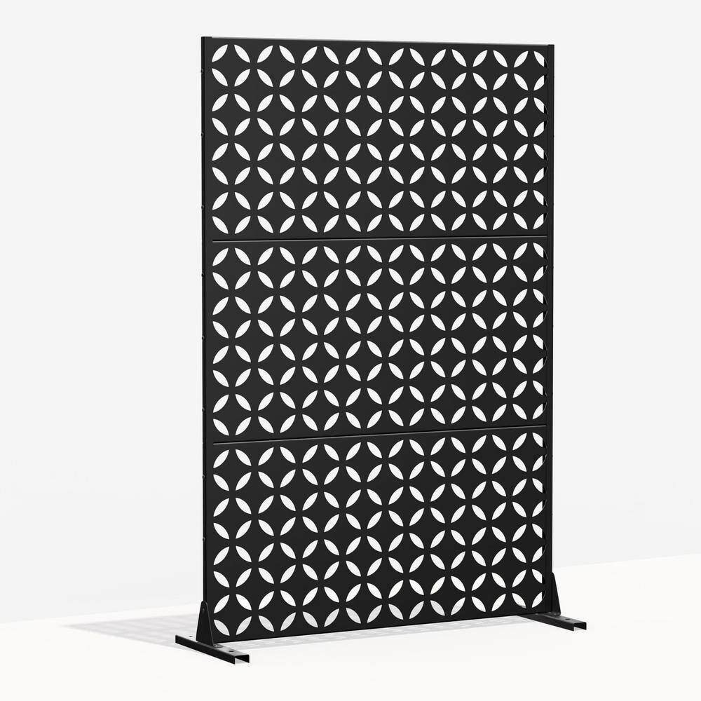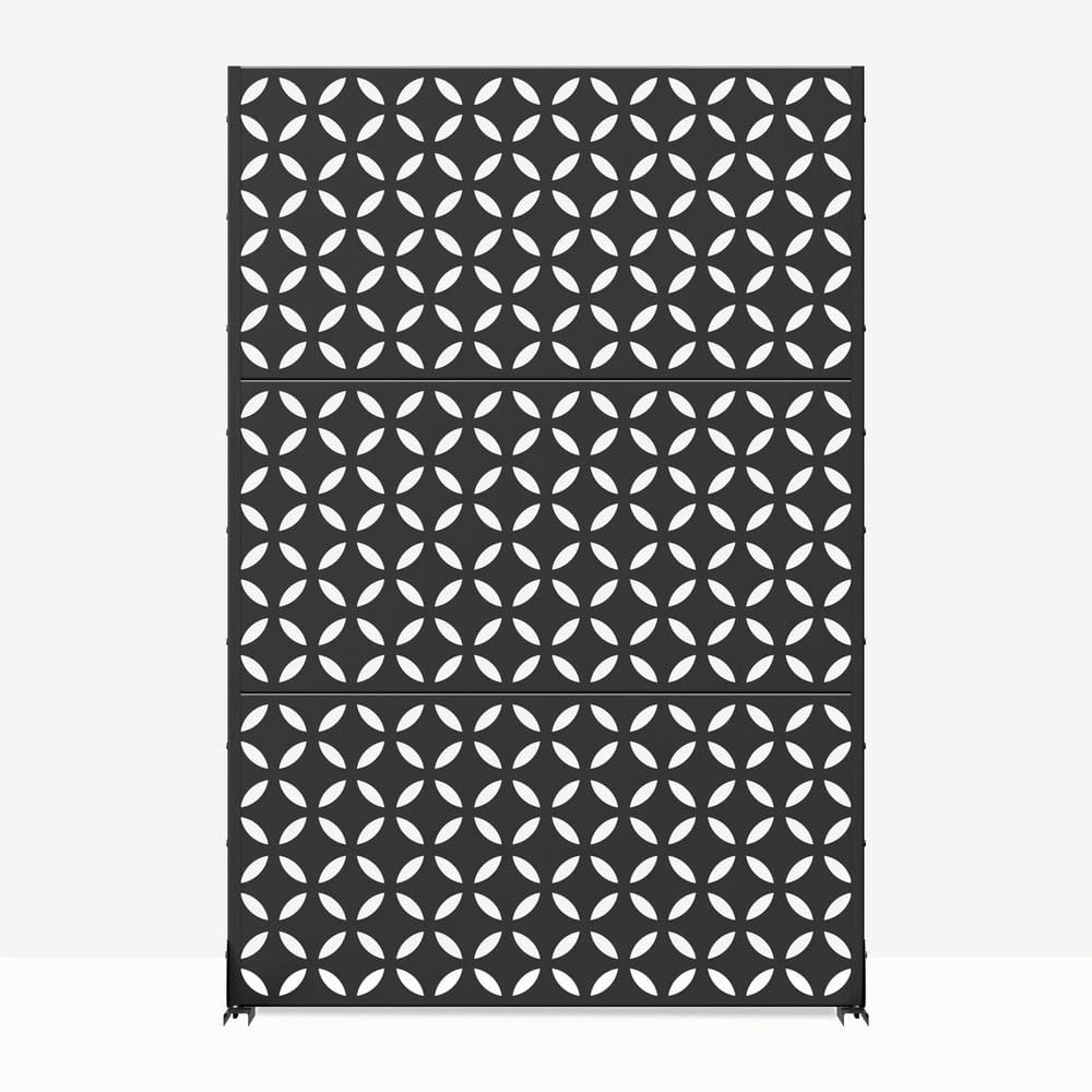 The cadeninc 3.92 ft. x 6 ft. Black Metal Privacy Screen Panel is a stylish and functional solution for outdoor and indoor privacy needs. Made from high-quality galvanized steel, this freestanding panel provides excellent durability and weather resistance, ideal for defining spaces while enhancing your outdoor aesthetics. Its modern louvered design not only offers privacy but also serves as an attractive backdrop for plant displays and outdoor decor.