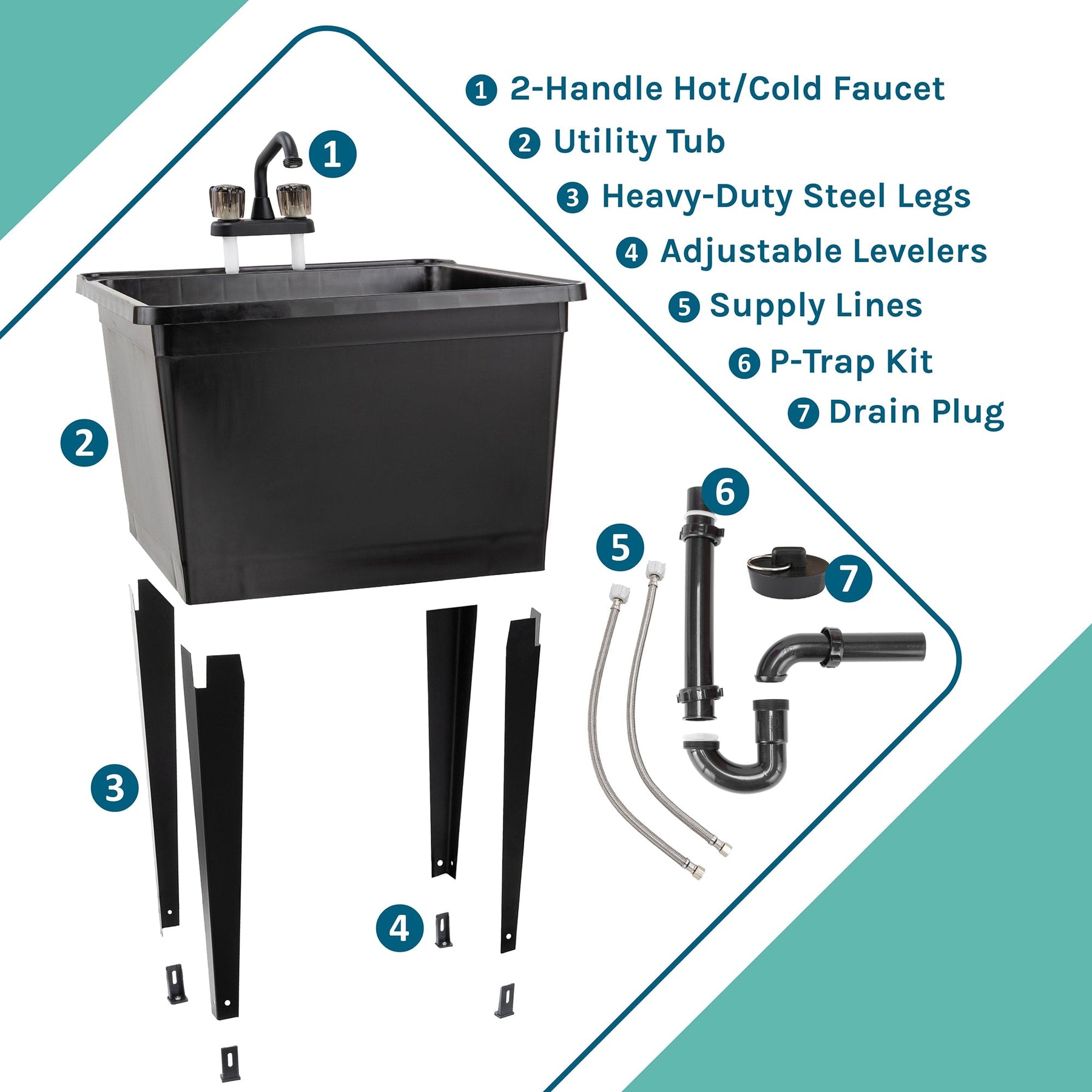 The Cambridge Resources Black Freestanding Utility Tub, with its 21-gallon capacity, is ideal for managing large and bulky cleaning tasks. This polypropylene utility tub comes with a complete installation kit, including a nonmetallic faucet with acrylic handles and steel legs. It provides functionality and durability, perfect for basements, garages, or laundry rooms.