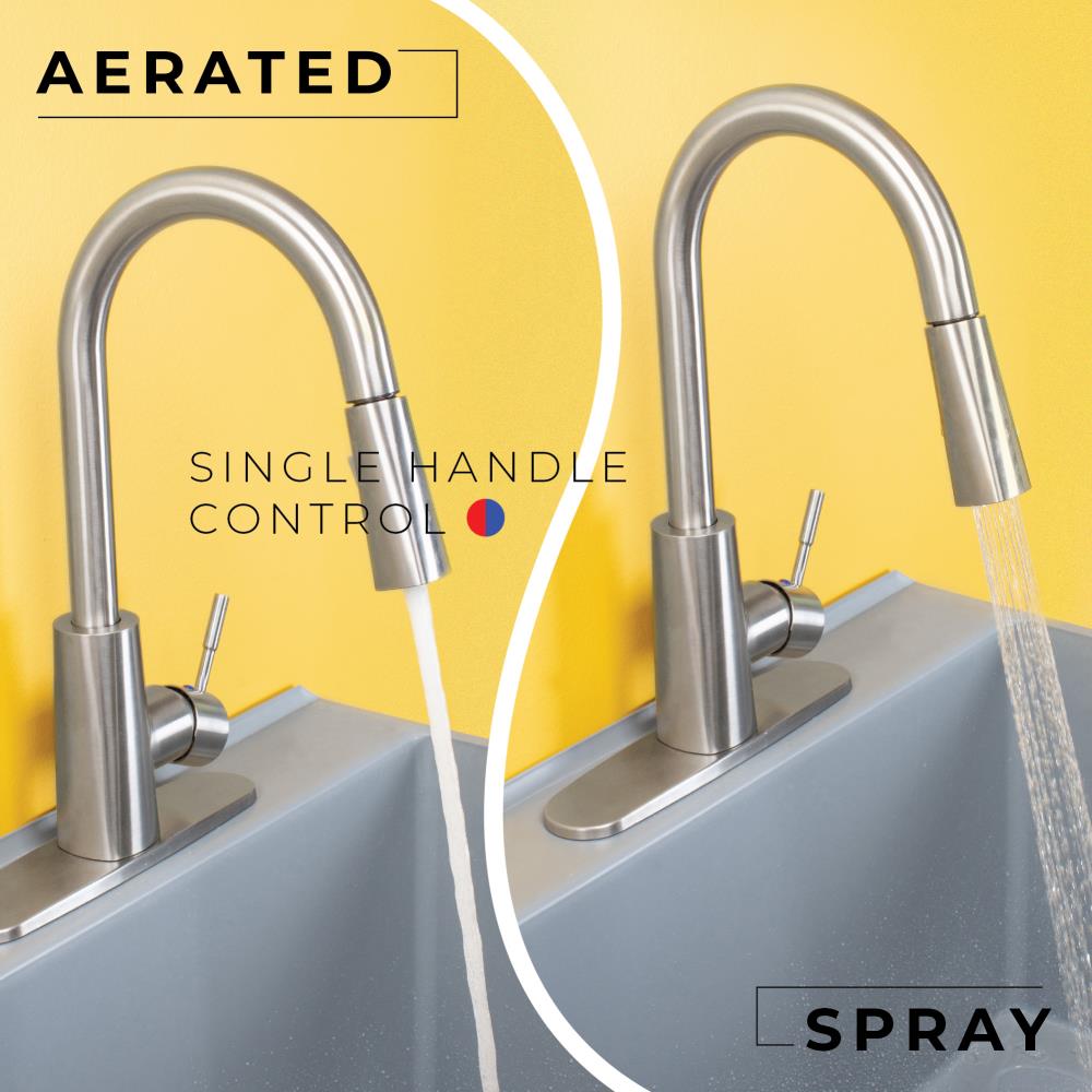 A: Yes, it features a dual-function pull-down faucet that switches between spray and stream modes.