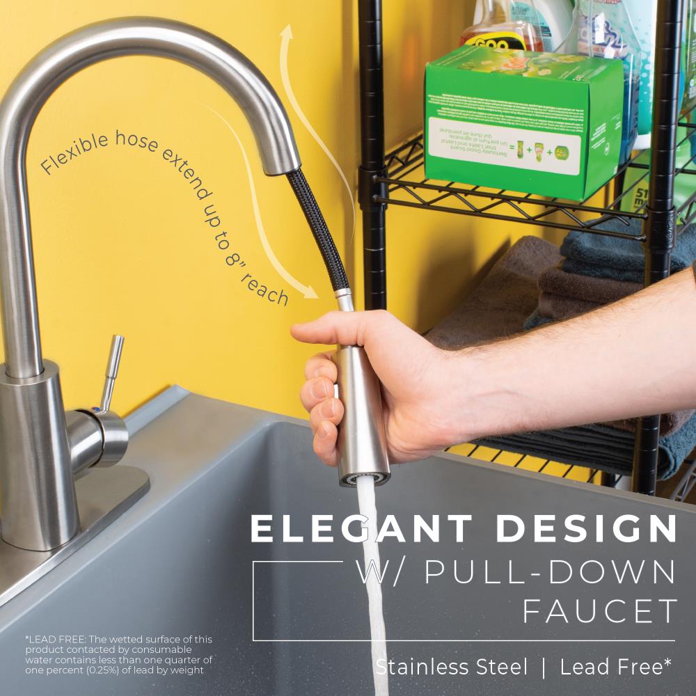 • High-Arc Pull-Down Faucet: Dual function spray or stream with 16-inch reach.