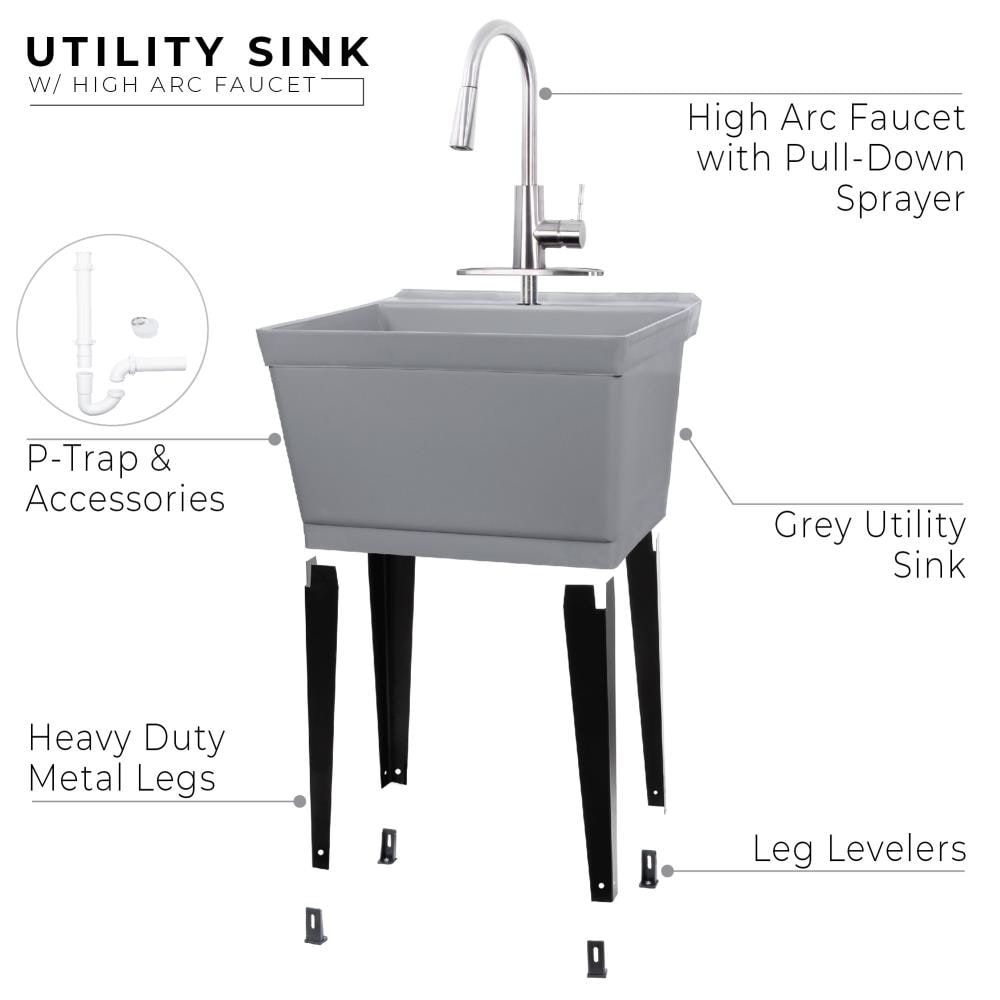 The Cambridge Resources Freestanding Utility Tub is a stylish and durable solution for any utility or laundry room. Featuring a heavy-duty thermoplastic tub, this 23.5-inch gray basin includes a 16-inch high-arc pull-down faucet with dual water functions, providing versatile use for cleaning tasks. Its design withstands rust, mildew, and wear, ensuring a long-lasting and practical addition to any space.