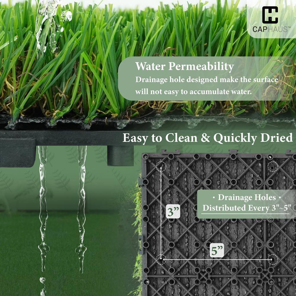 CAPHAUS Interlocking Artificial Grass Turf Tiles offer a lush, green solution for both indoor and outdoor spaces. These self-draining, UV-resistant tiles are perfect for pet areas or decorative enhancements, boasting a realistic look and feel that is easy to maintain. With their simple interlocking system, installation is a breeze—bringing life to any area while saving you time and effort in upkeep.