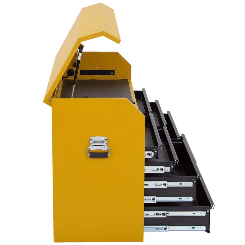 A: Indeed, it features a built-in power strip, perfect for charging or powering your tools directly from the chest.