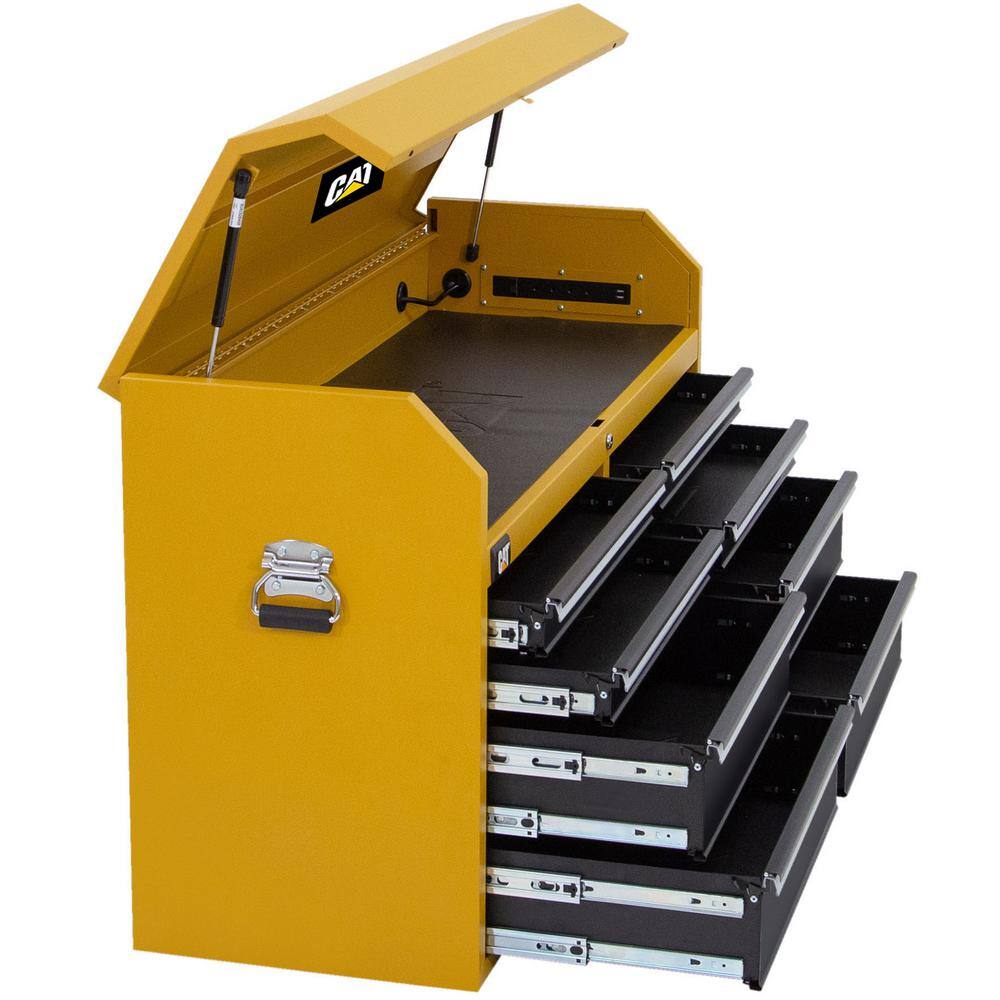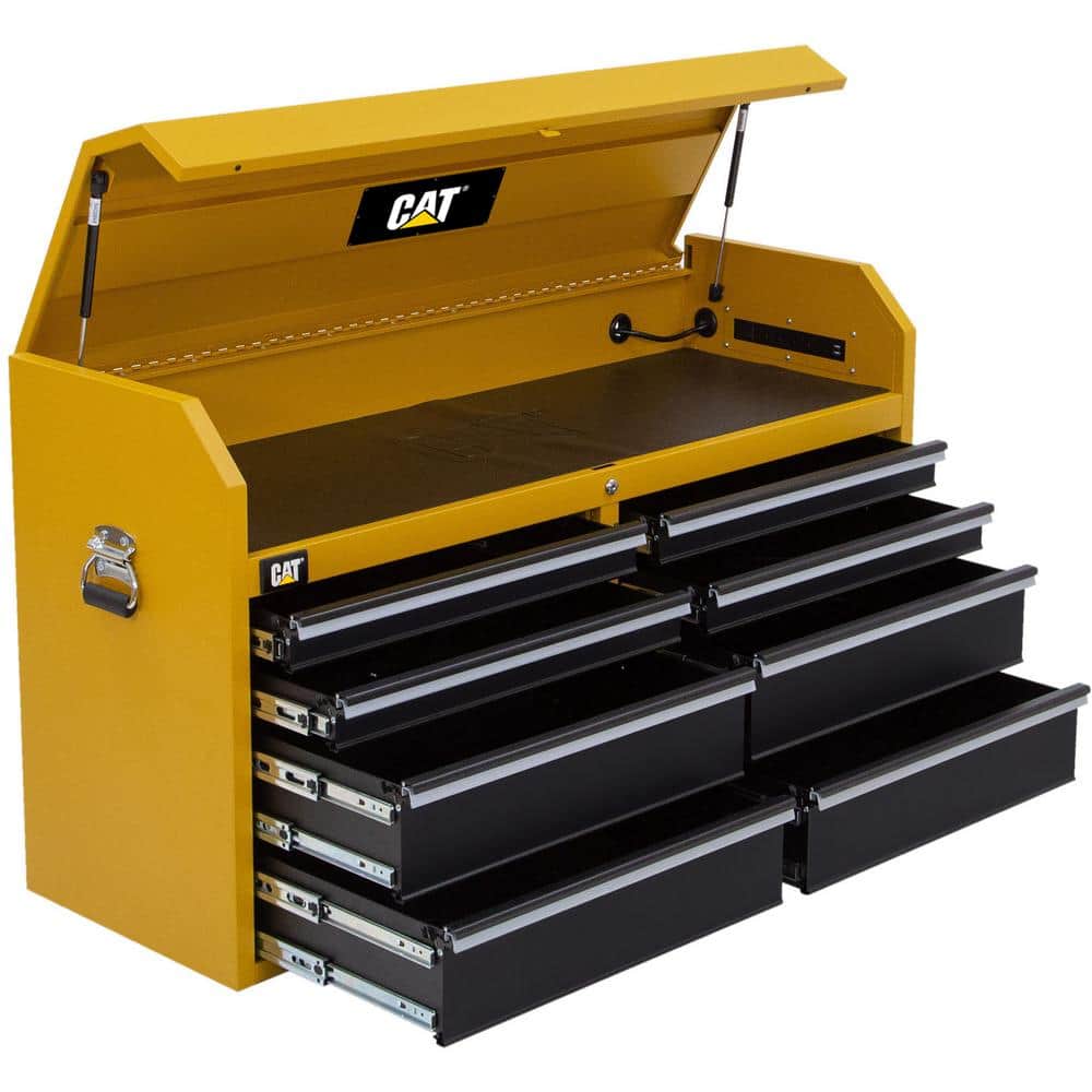 Enhance your work efficiency with the CAT 52-inch Heavy Duty Top Tool Chest. Designed for professional contractors and serious DIYers, this 8-drawer tool chest offers substantial storage and features a built-in power strip for convenient charging of your power tools. The heavy-duty construction and soft close drawer slides make it a durable and practical addition to your workspace.