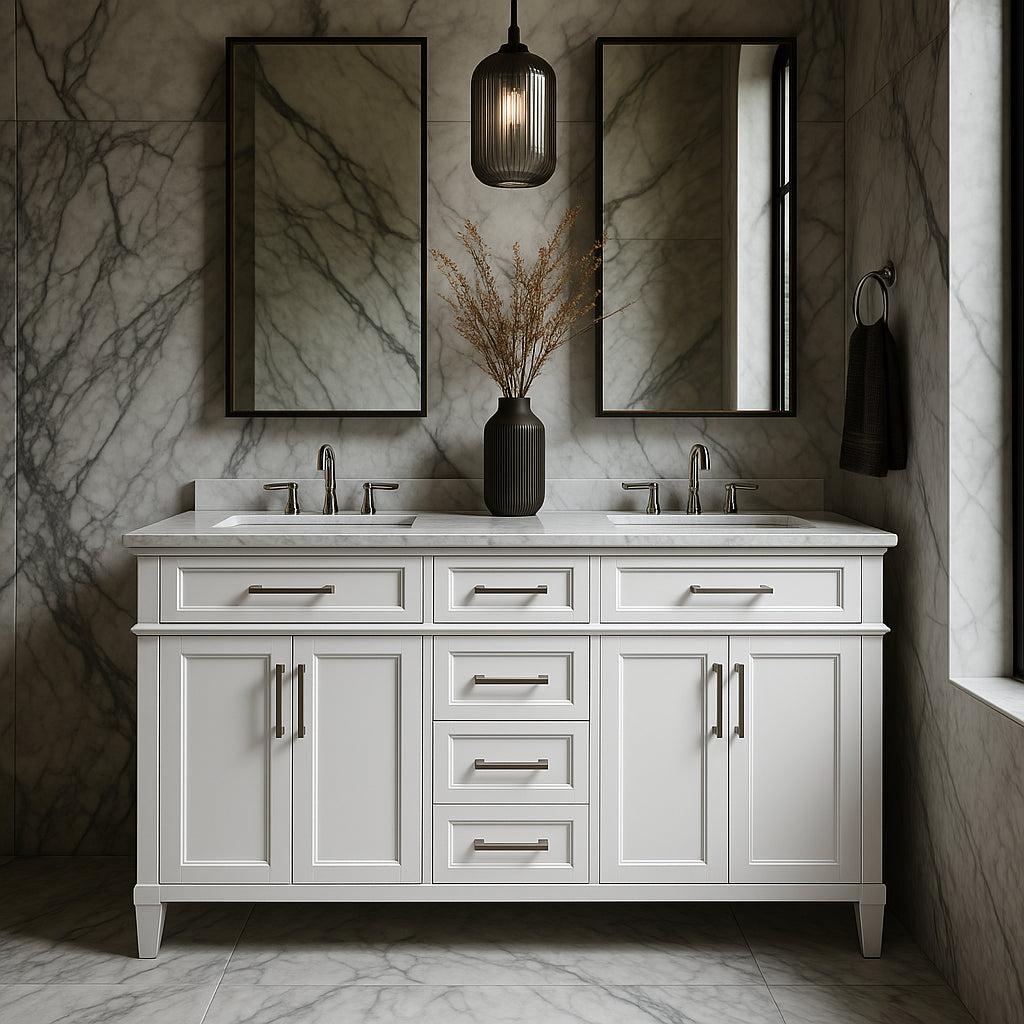 The Caville 60-inch Double Sink Vanity combines traditional elegance with modern functionality. Featuring a Carrara marble countertop, ample storage, and integrated electrical outlets, this vanity is perfect for enhancing any bathroom space.