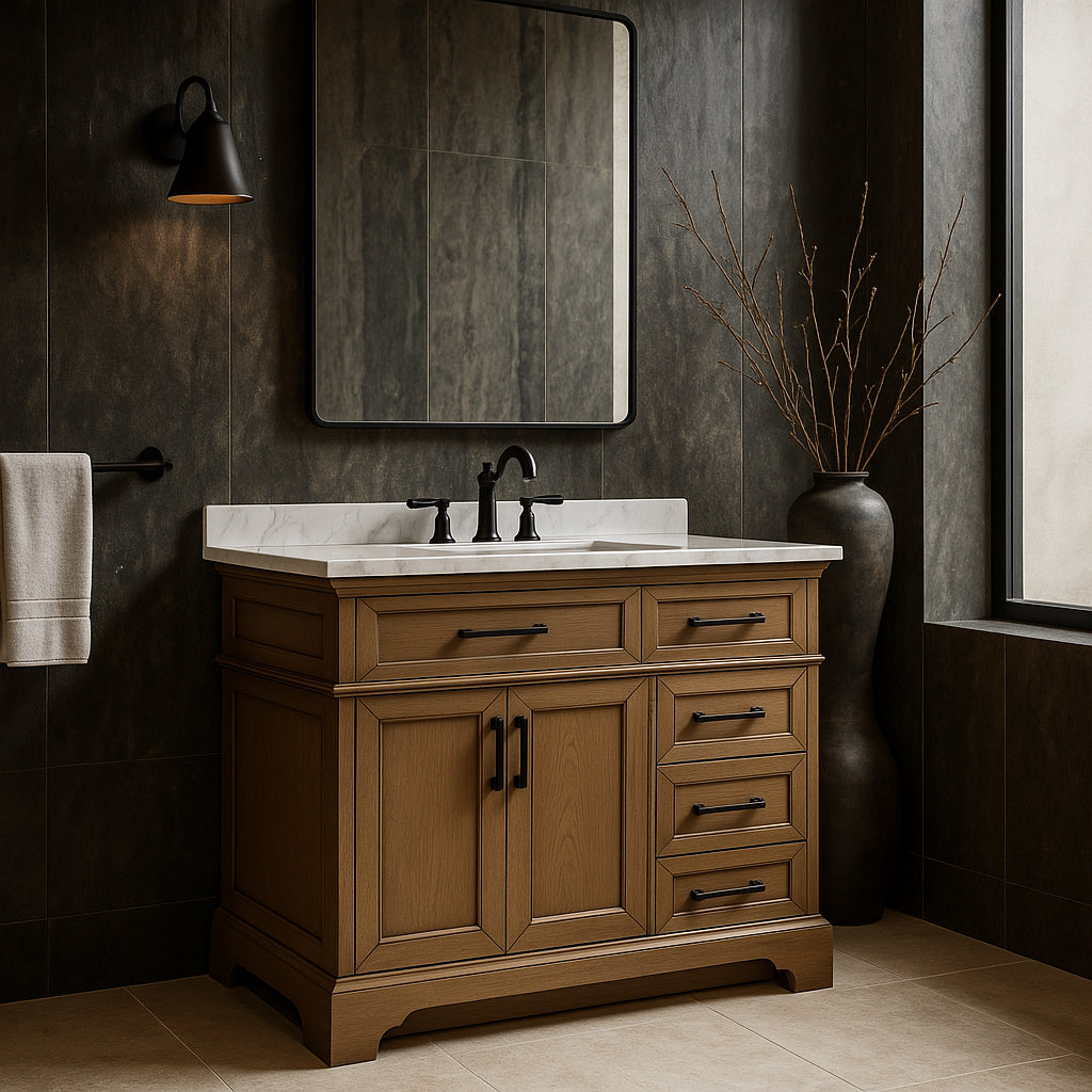 The Cherrydale Vanity combines rustic charm with modern functionality, featuring a durable engineered marble countertop, ample storage, and a soft-close mechanism. Perfect for enhancing any bathroom space.