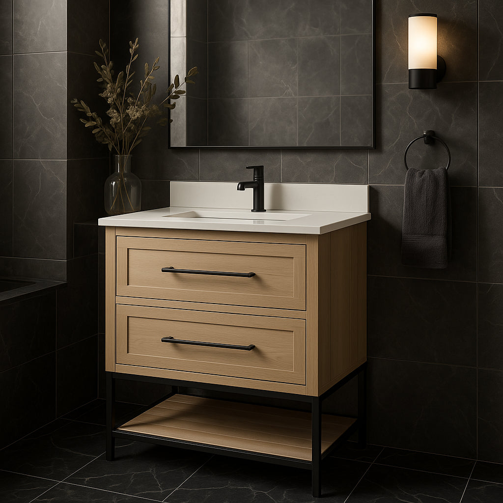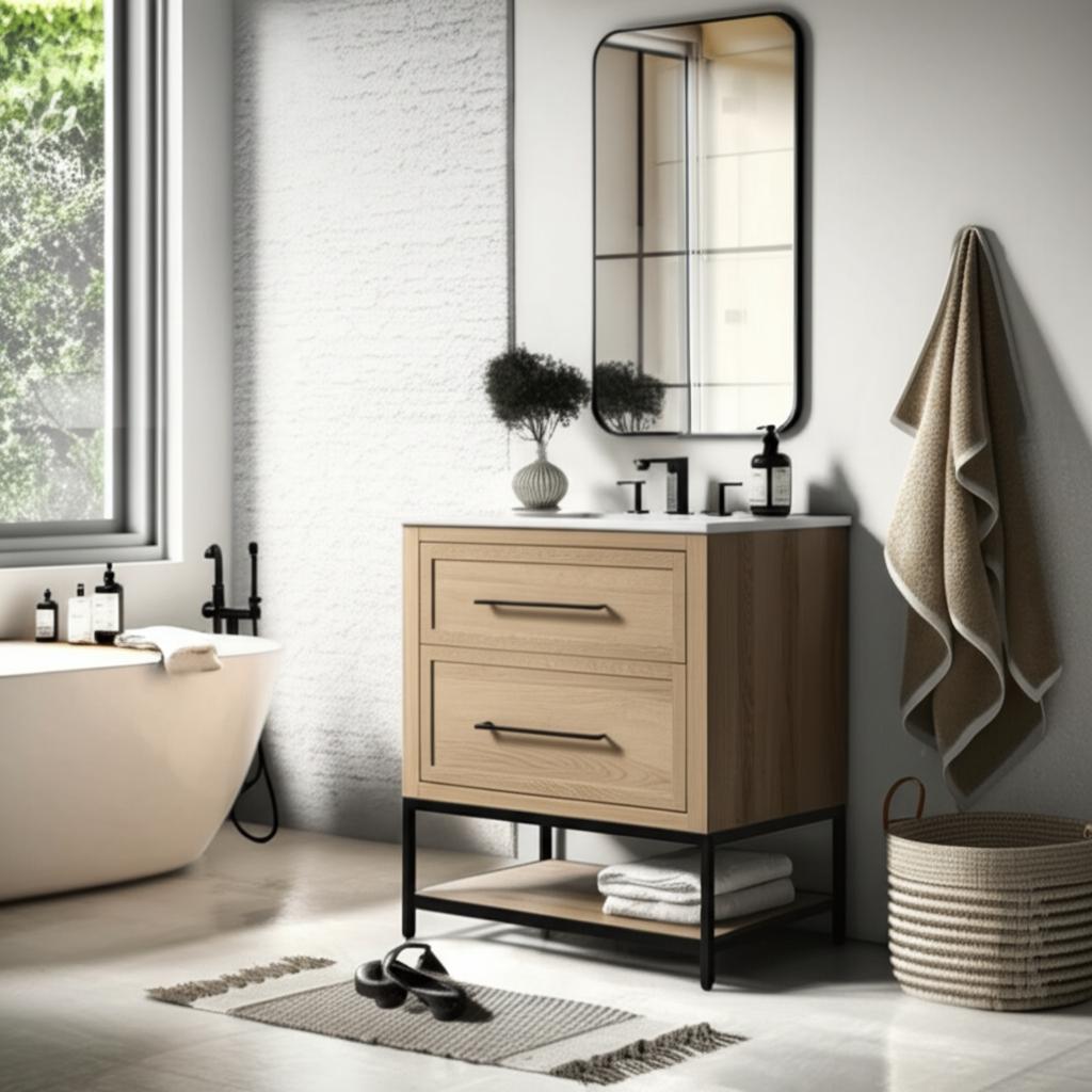 - Weathered Tan Finish: Complements modern farmhouse and industrial-style bathrooms.