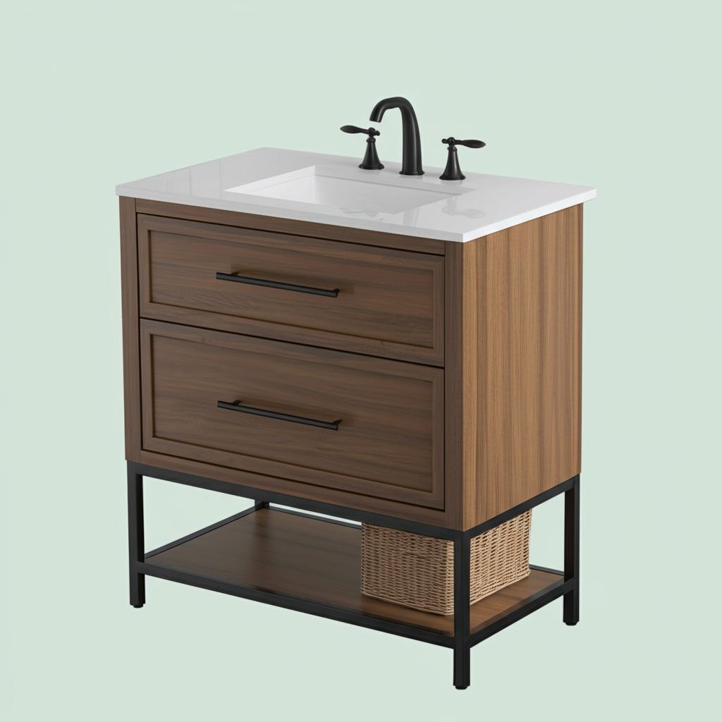 The Corley Vanity combines modern farmhouse charm with industrial elegance, featuring a spiced walnut finish, brushed gold hardware, and a durable engineered stone countertop. Perfect for enhancing any bathroom space.