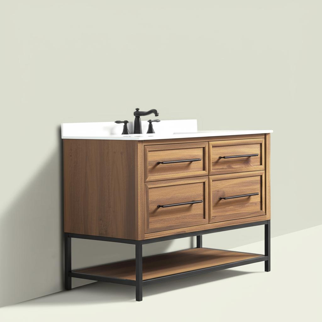 The Corley 42" Single Sink Vanity combines rustic charm with modern functionality, featuring a spiced walnut finish, engineered stone top, and ample storage space. Perfect for enhancing any bathroom decor.