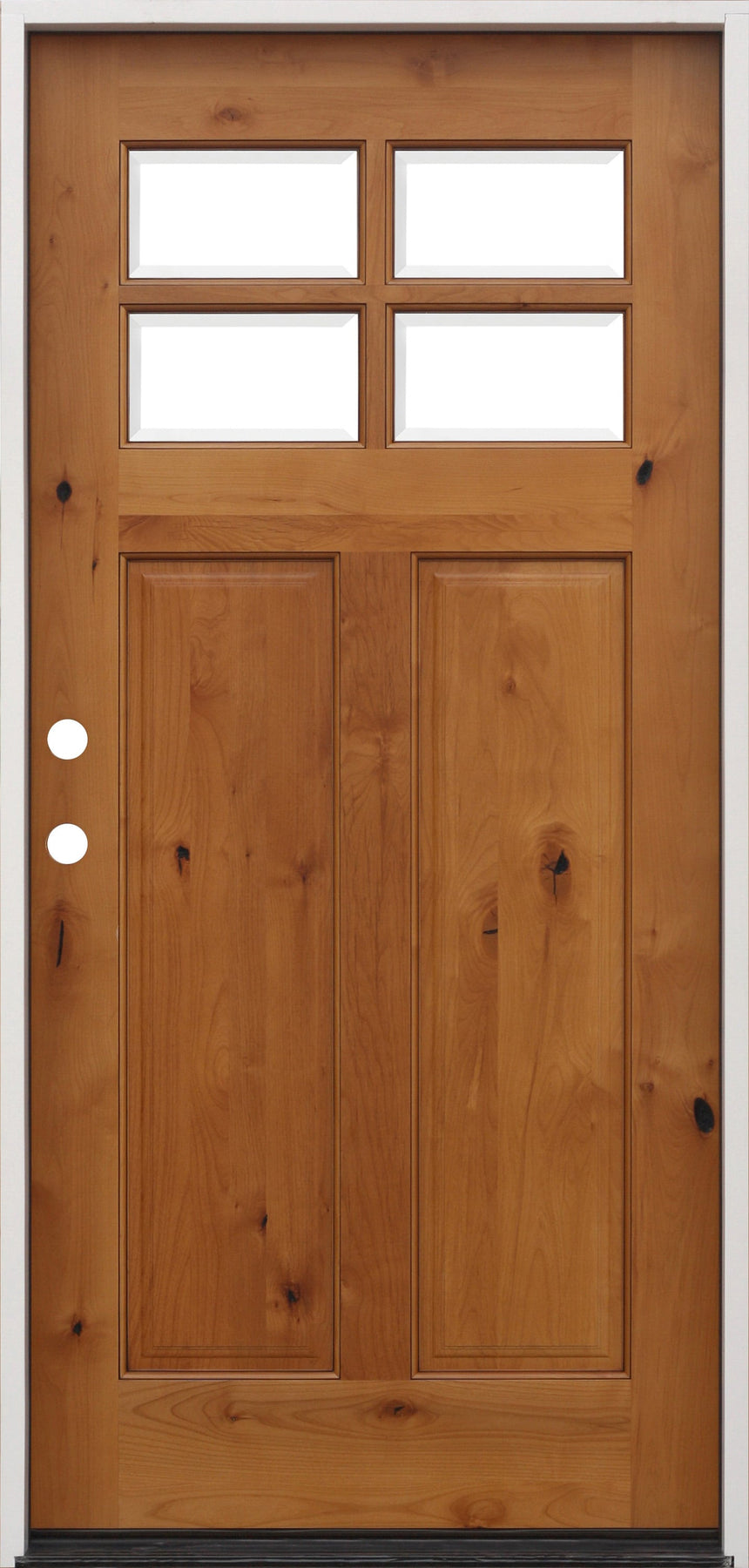 Elevate your home's entrance with the Creative Entryways Craftsman Prehung Front Door, featuring a solid hardwood core and elegant decorative glass. The golden alder stained finish and rustic knotty alder offer timeless beauty and strength, enhanced by advanced hurricane-resilient construction standards.