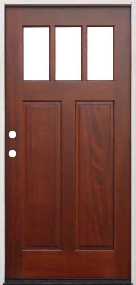 Elevate your home's entrance with the Creative Entryways Craftsman Front Door. This prehung classic is crafted from rich mahogany, with an oil-based polyurethane finish for superior durability. The dual-pane clear glass adds a touch of elegance, ensuring your entrance makes a sophisticated statement.
