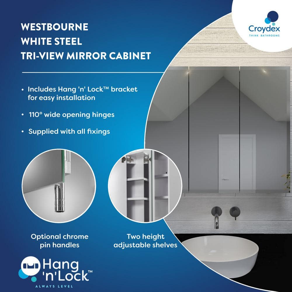 Upgrade your bathroom with the Croydex Frameless Tri-View Medicine Cabinet, designed with elegance and practicality in mind. Its frameless mirrored doors and easy-to-install Hang N Lock system make it a favorite among pros and DIY homeowners alike. With adjustable shelves and sturdy white steel construction, it’s the perfect blend of style and functionality.