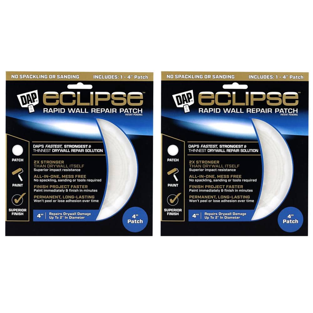 The DAP 4 in. Eclipse Wall Repair Patch offers a revolutionary way to quickly and easily fix drywall damage. This innovative patching solution means no spackling or sanding - simply apply and paint immediately for a flawless finish in minutes. Perfect for patching up small everyday damage, it's the fastest and most durable solution for your wall repair needs.
