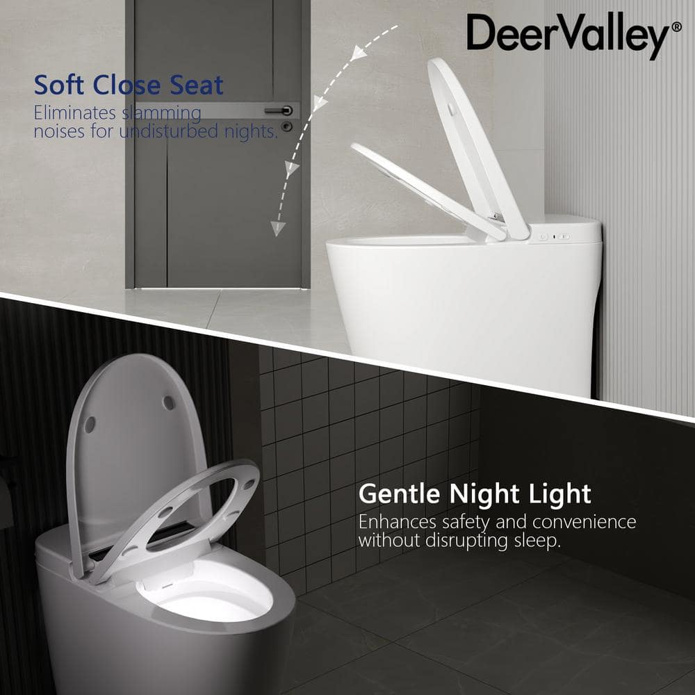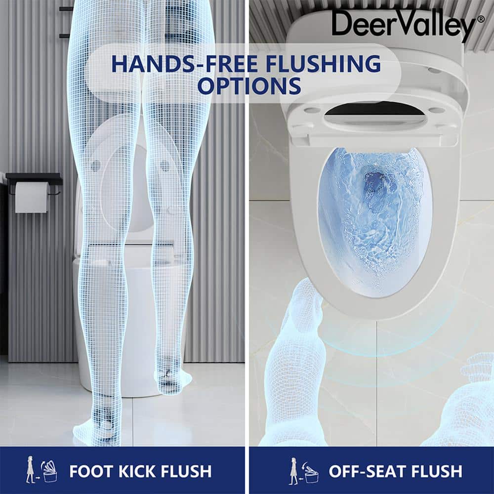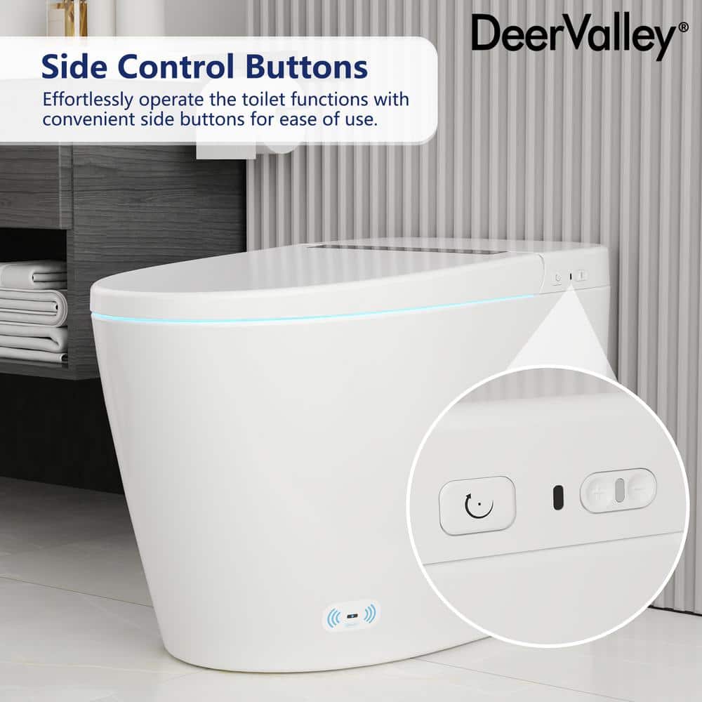 Upgrade your bathroom with the DEERVALLEY 1-Piece 1.28 GPF Toilet featuring a heated seat, auto flush, and energy-saving capabilities. This smart toilet combines luxury and efficiency, with cutting-edge features like a nano-antibacterial glazed bowl to prevent stains and an eco mode to save water and power.
