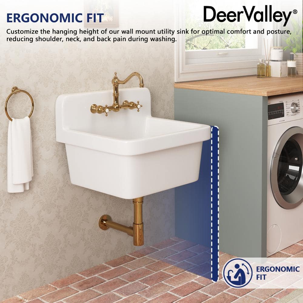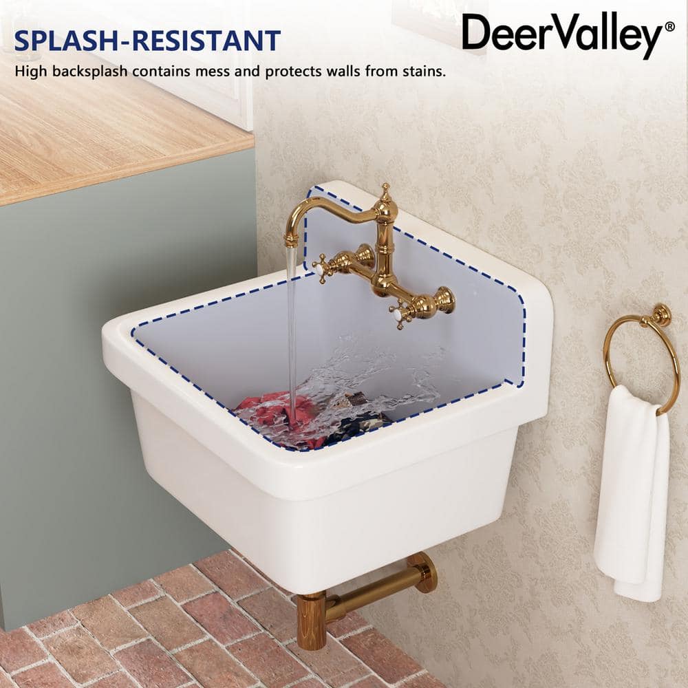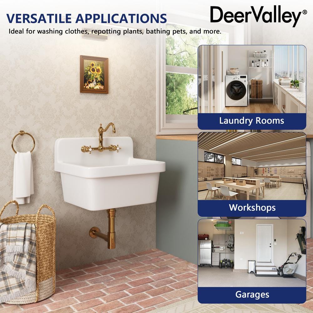 Elevate your laundry or utility space with the DEERVALLEY Ceramic Wall Mount Laundry Utility Sink. This elegant, durable sink features a space-saving wall mount design, perfect for tight areas. Its high backsplash and 8.86-inch deep basin provide splatter protection and ample space for various tasks, enhancing both form and function.