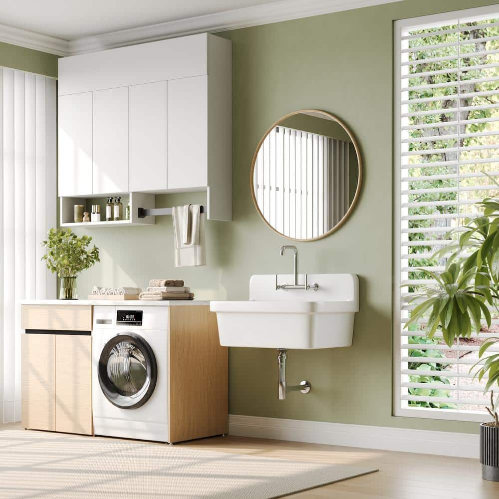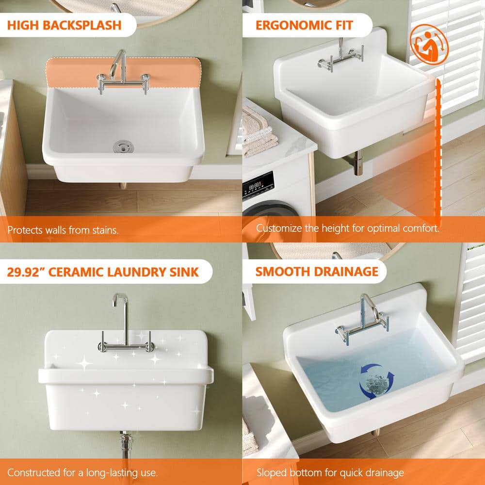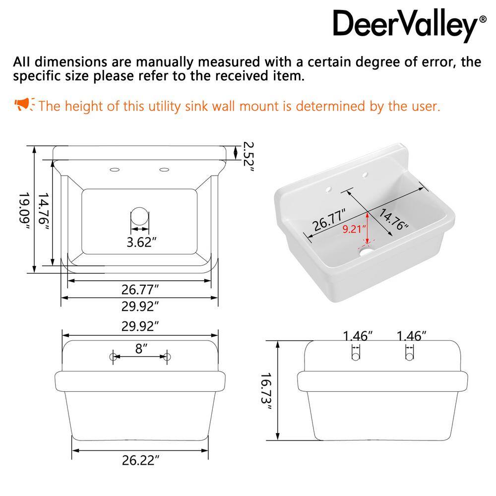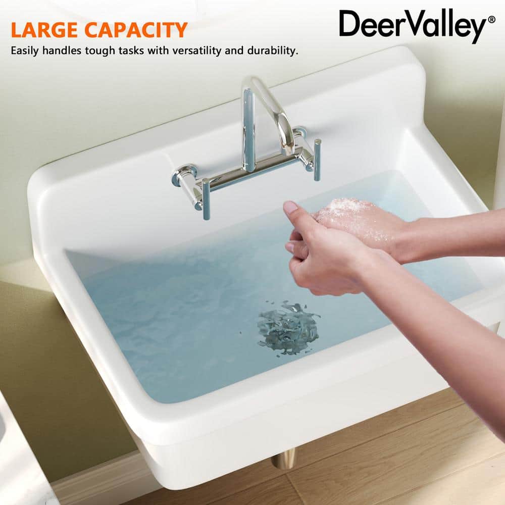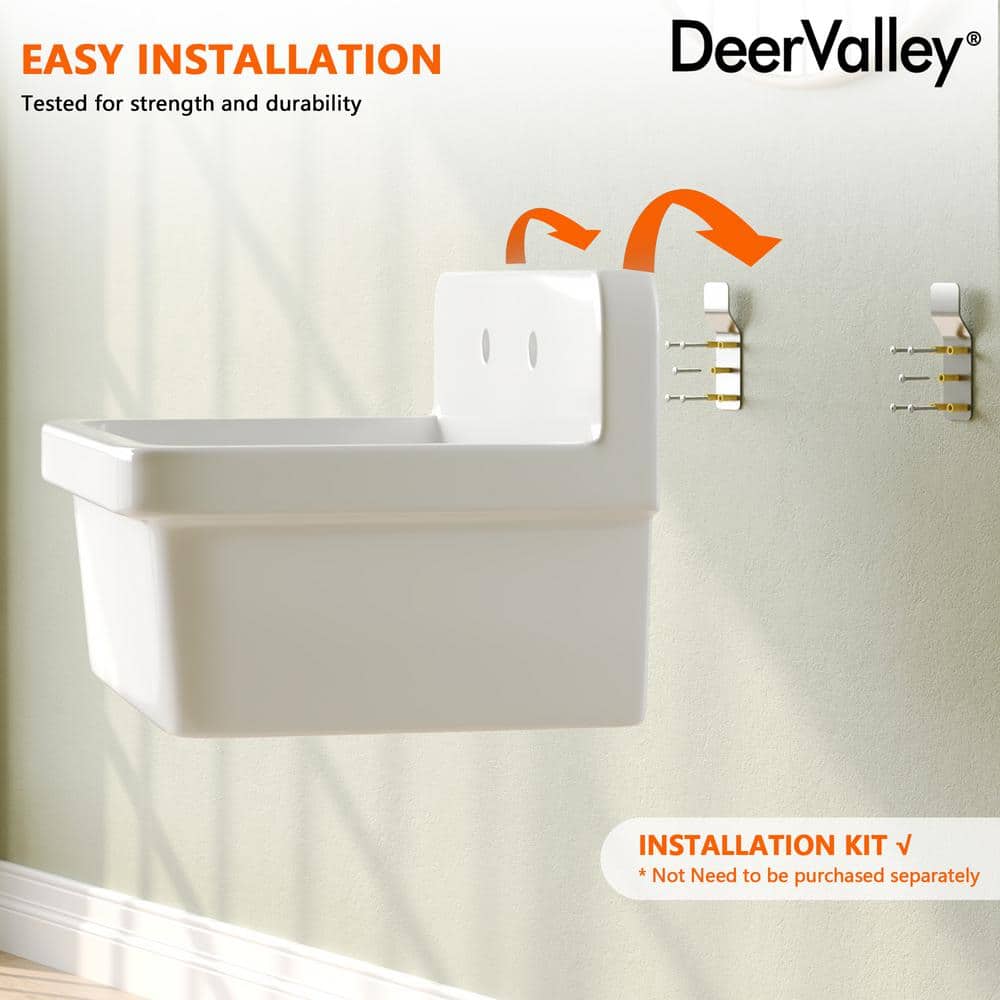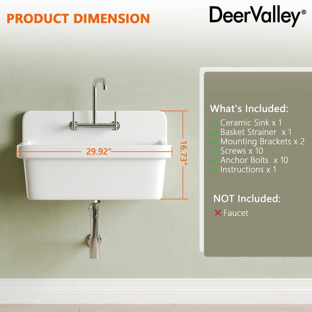 The DEERVALLEY 30 in. Wall Mount Laundry/Utility Sink offers a seamless blend of durability and elegance with its high-quality fireclay construction. Designed to resist scratches, stains, and cracks, its smooth, glazed finish ensures easy cleaning with just mild soap and water. Featuring a sleek and modern look, it's the perfect choice for enhancing functionality and style in laundry rooms, kitchens, and bathrooms.