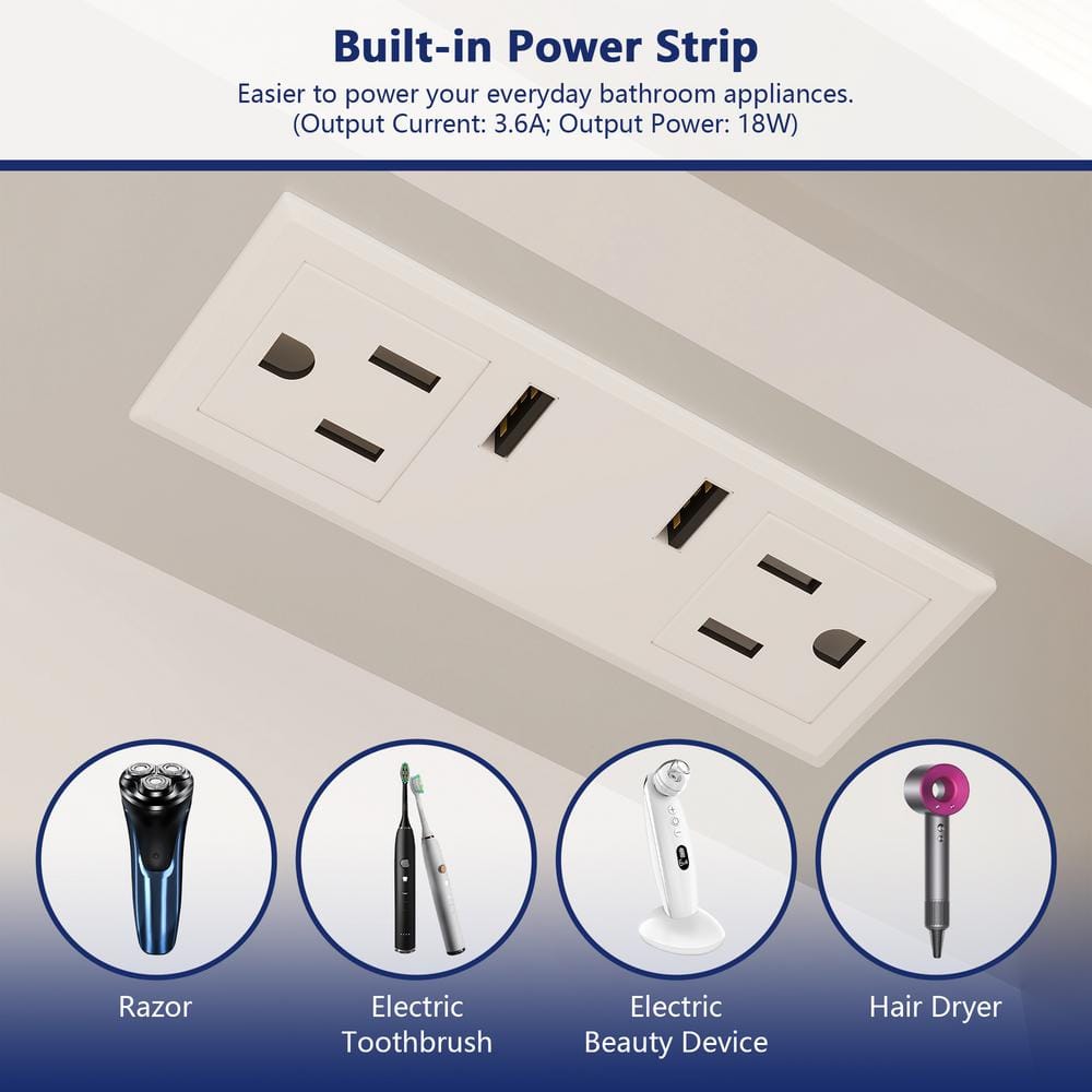Spacious Design: Two glass shelves and dual USB outlets provide plenty of storage and charging options for bathroom essentials.