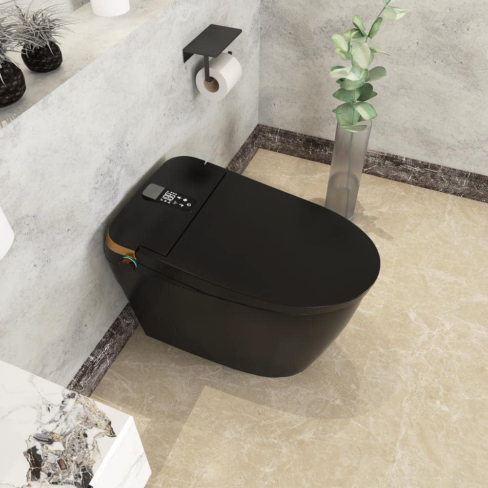 Transform your bathroom into a luxurious oasis with this Smart Elongated Bidet Toilet. Combining cutting-edge technology with sleek design, it features a hands-free, water-efficient flush, automatic deodorization, and a heated seat for ultimate comfort. The matte black finish and elongated shape add modern sophistication to any bathroom.