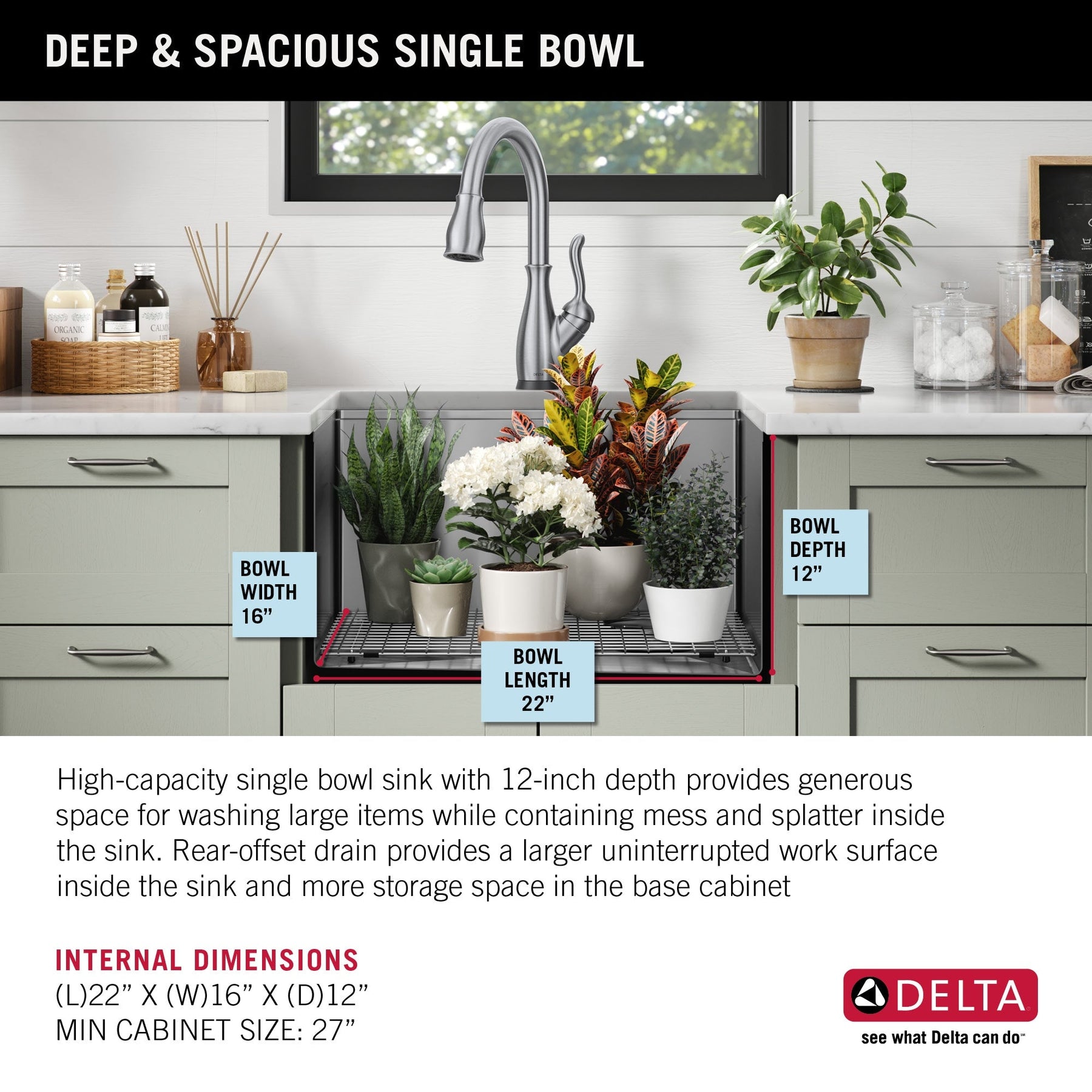 Ample Capacity: Features a 12-inch deep single bowl which is ideal for larger items and reducing splash during tasks.