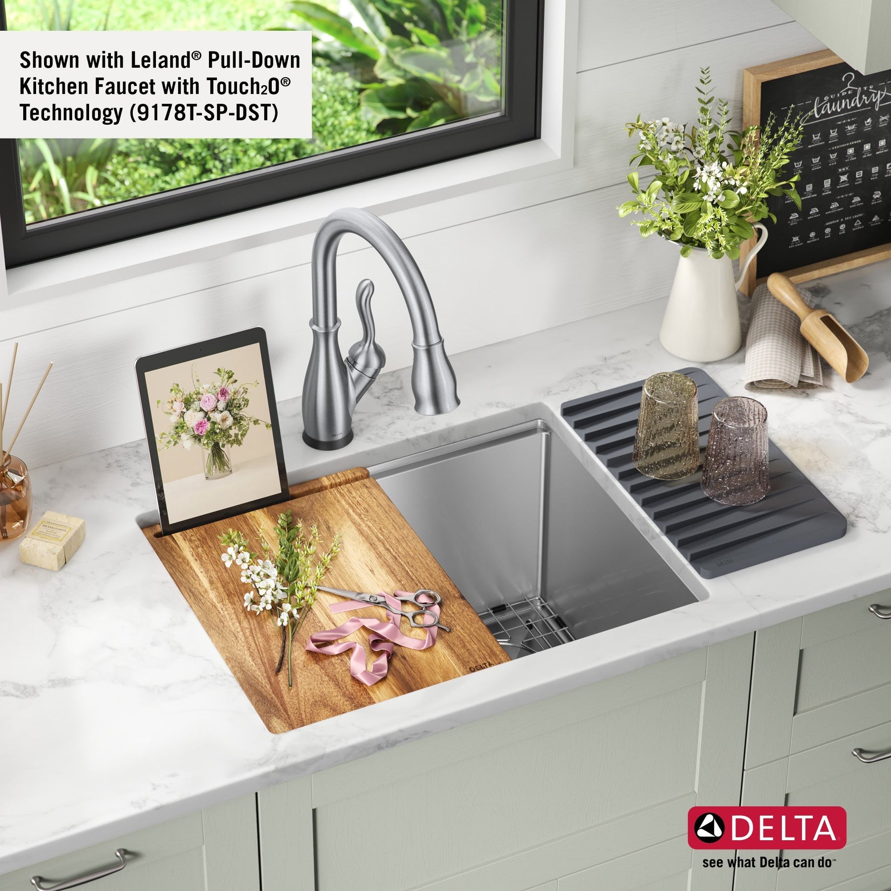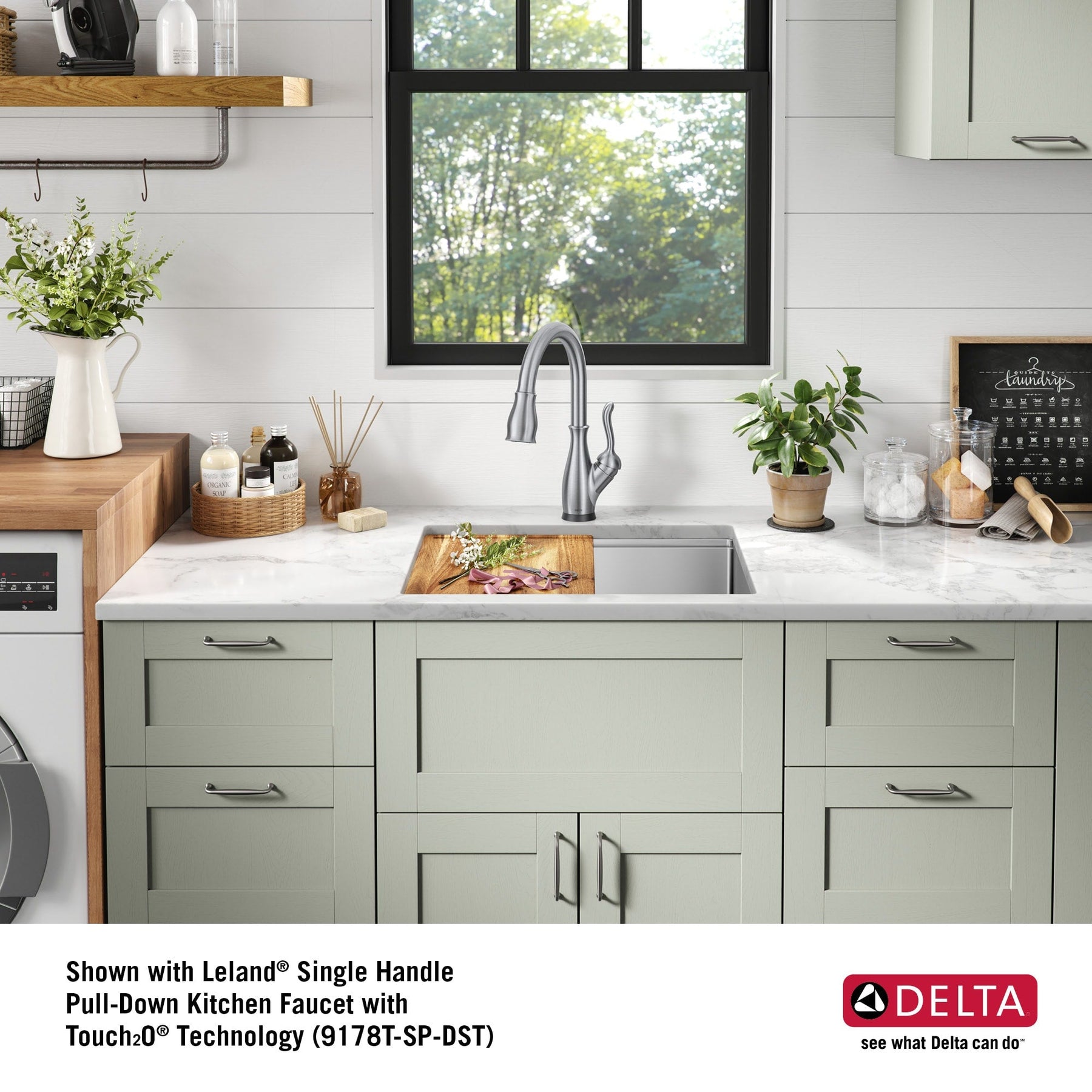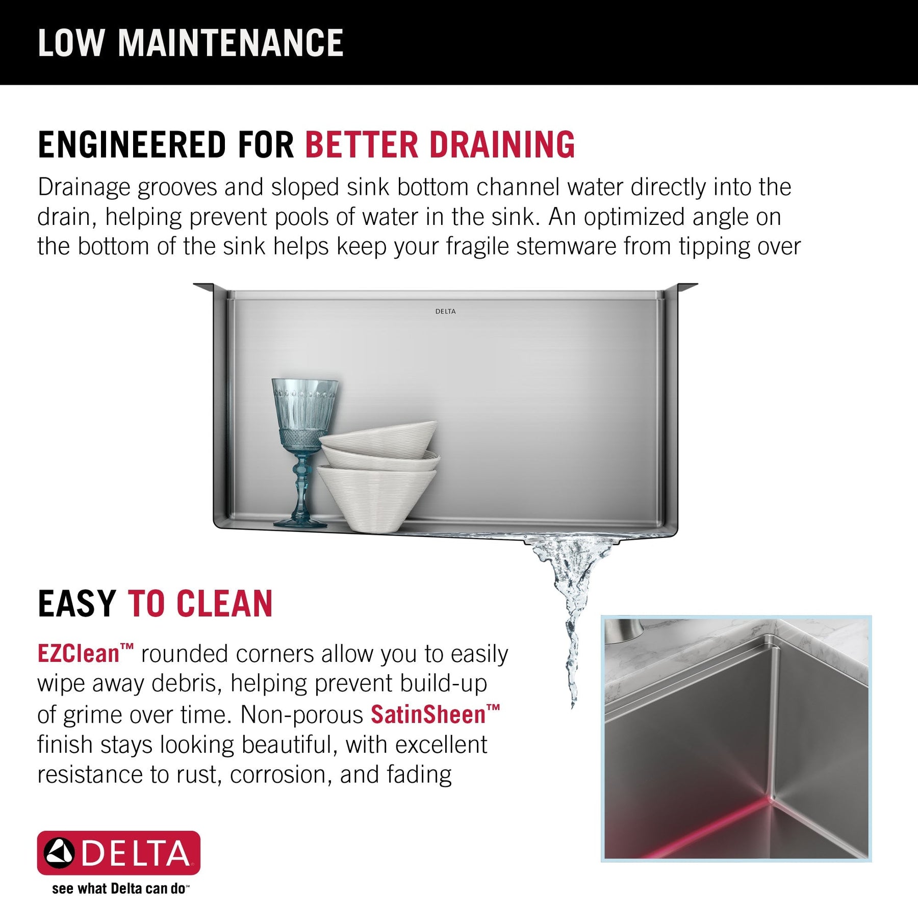The Delta Undermount Laundry Sink combines functionality and style with its multifunctional WorkFlow Ledge and sleek, durable design. Made from heavy-duty TRU16 gauge stainless steel, this sink is perfect for tackling utility tasks while maintaining a clean, noise-free kitchen or laundry room environment. Its undermount construction allows for seamless integration into countertops, providing a tidy look with easy maintenance.