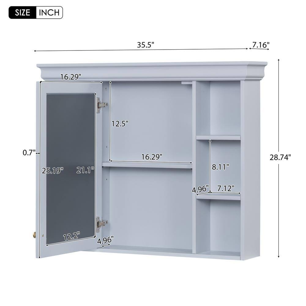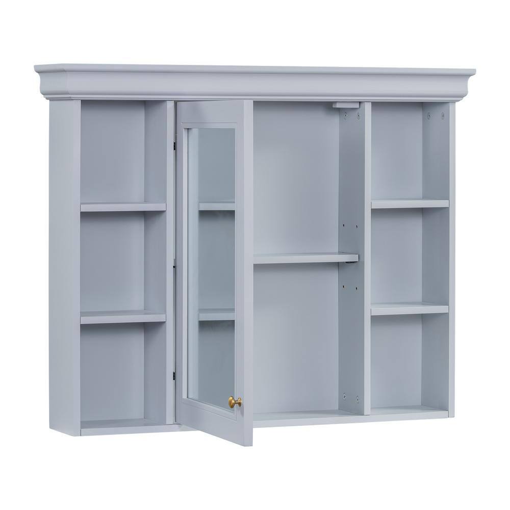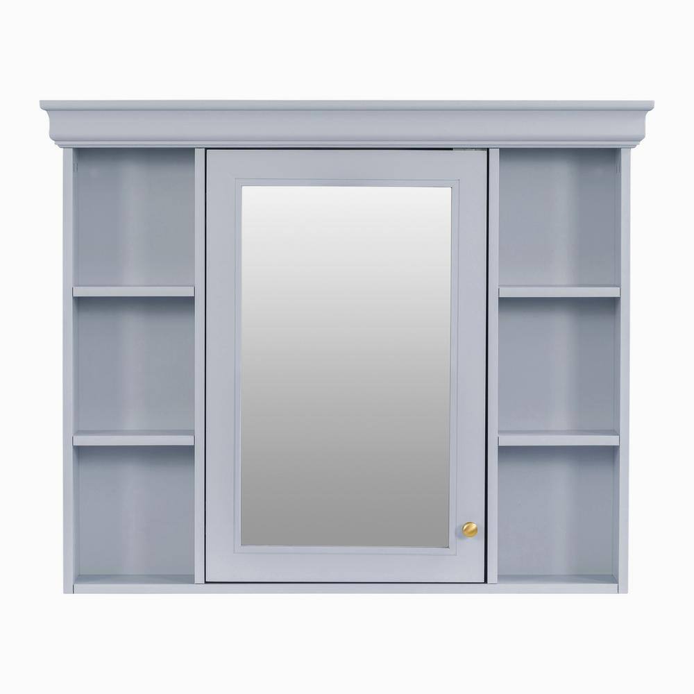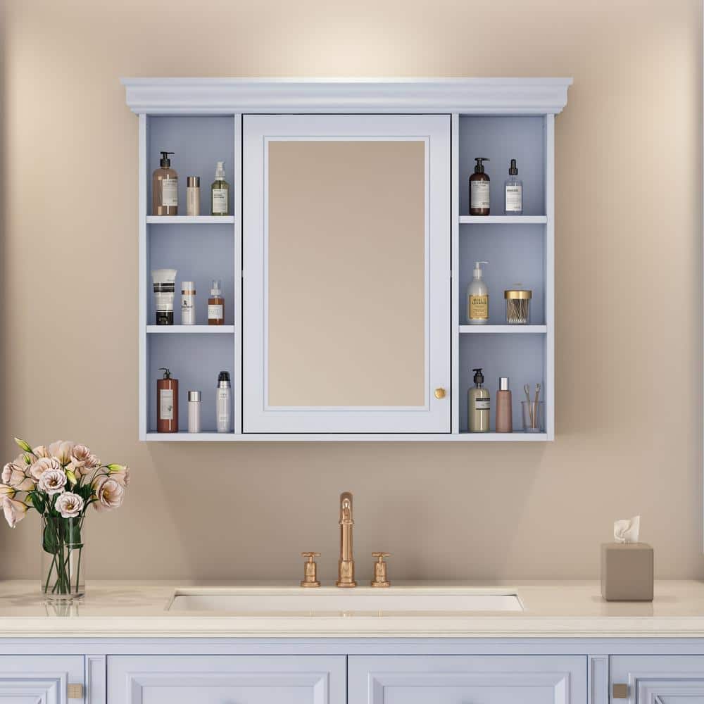 Transform your bathroom with the DELUXE DL LIVING Blue Wood Bathroom Medicine Cabinet. This exquisite cabinet features a central mirrored door, soft-close hinges, and open side shelves for easy access to essentials. Its classic design and gold-tone hardware bring elegance to any decor.
