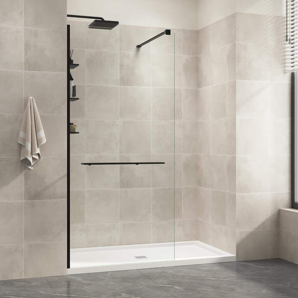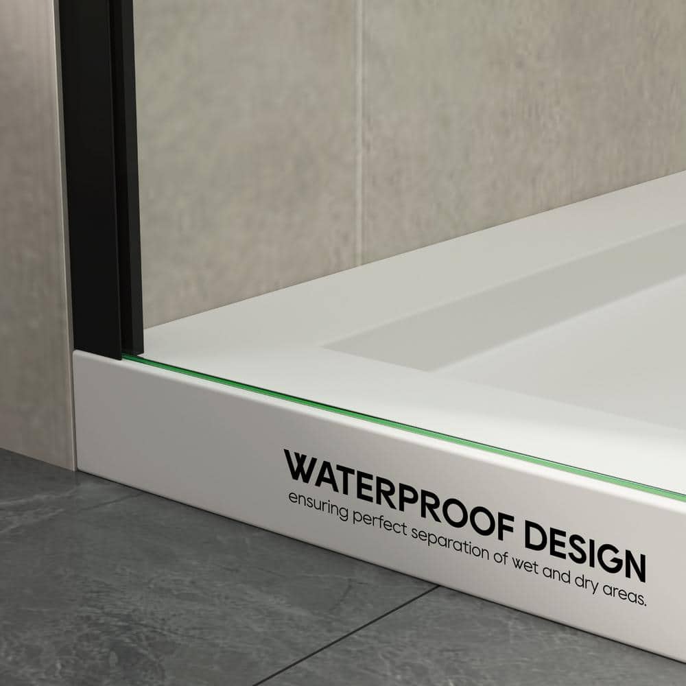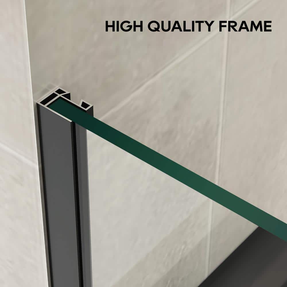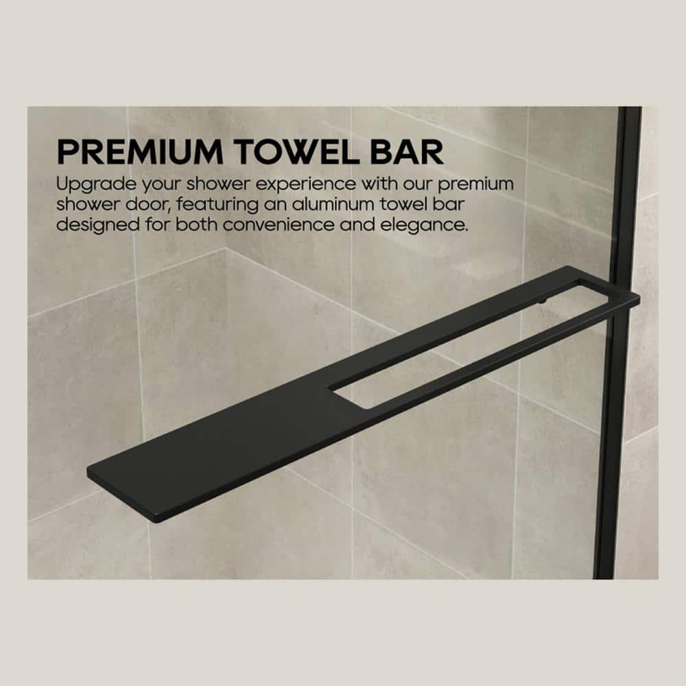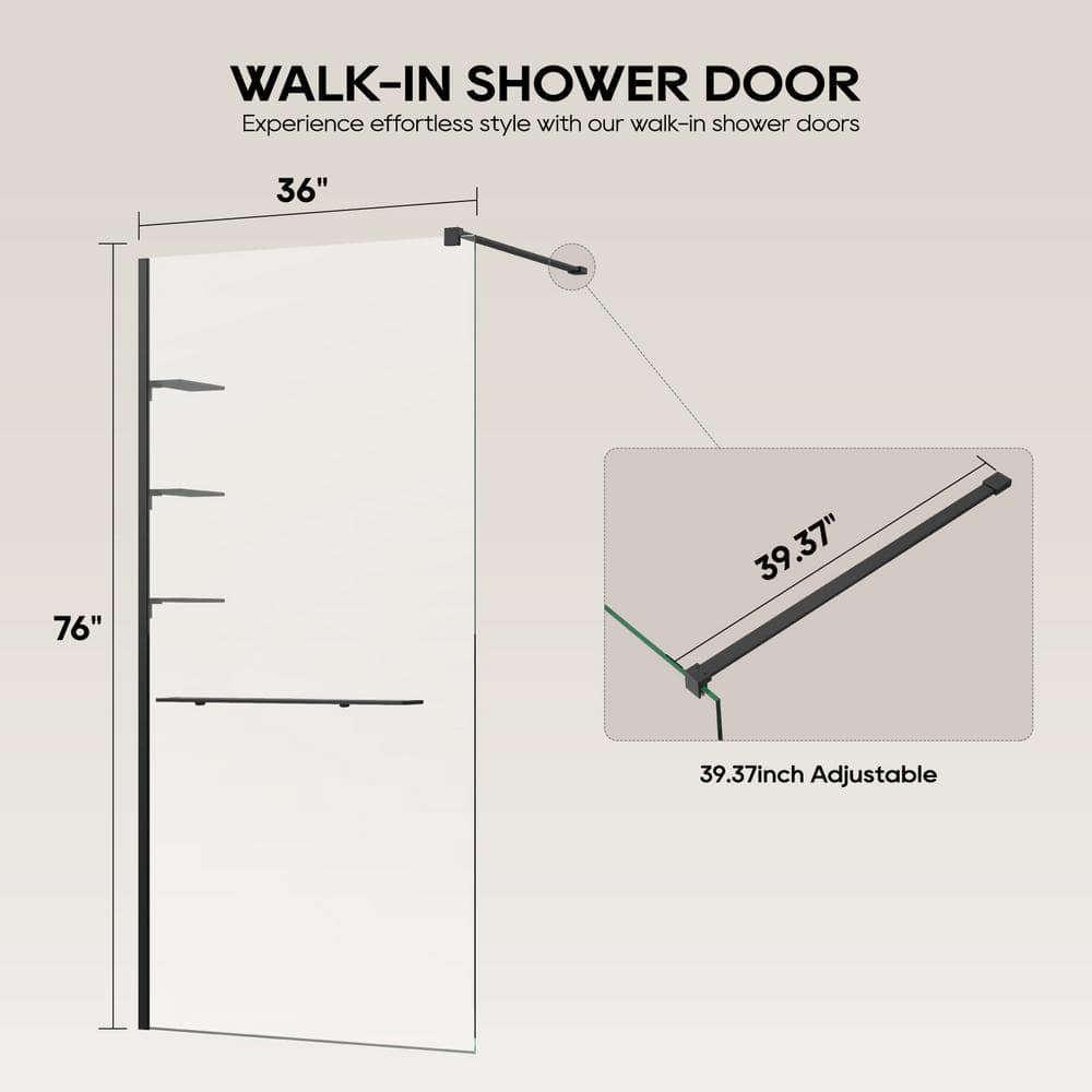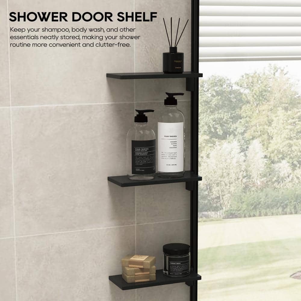 Transform your bathroom into a modern oasis with the LuxeSpa Frameless Shower Door by DELUXE DL LIVING. This 36-inch wide, 76-inch high glass panel offers a seamless appearance with its matte black finish and clear tempered glass. Equipped with practical storage solutions and a sleek towel bar, it’s the perfect blend of function, style, and durability.